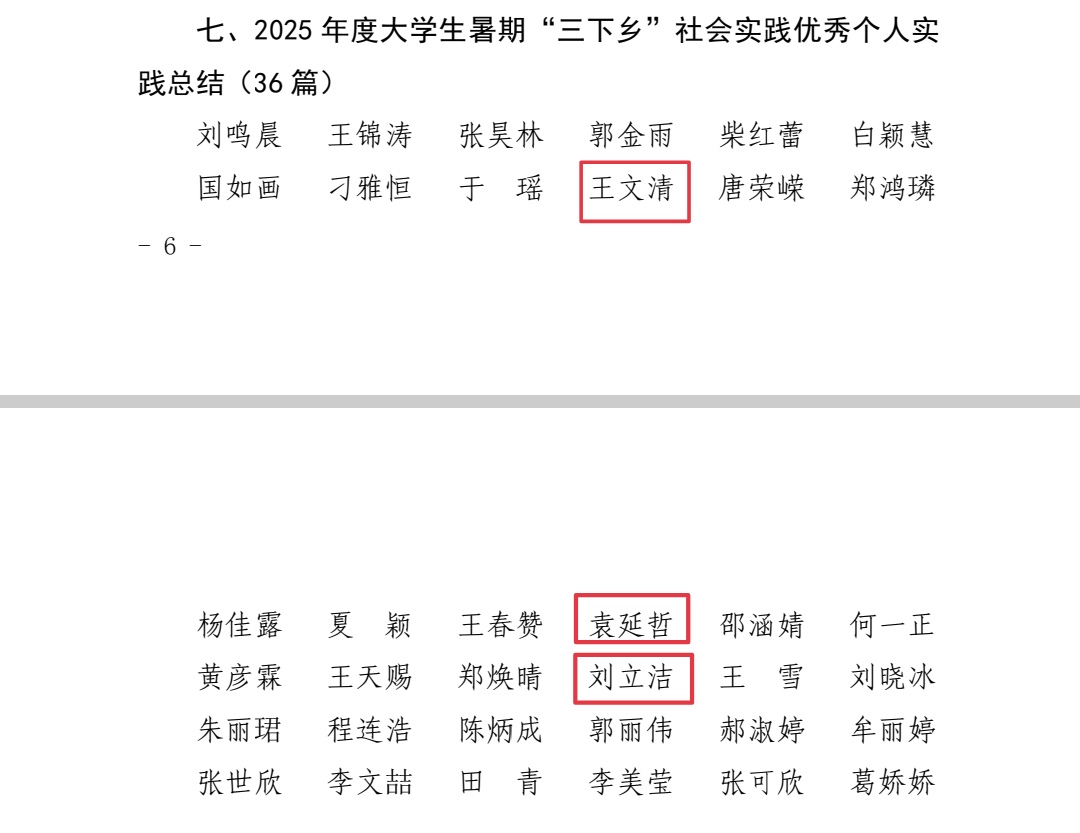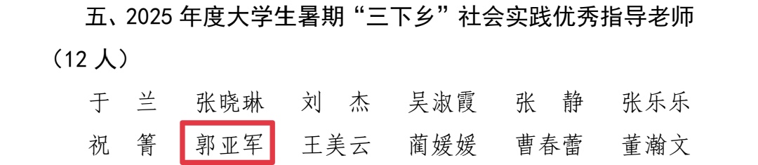 在本次表彰中,外国语学院收获多项重要奖项:剪艺志愿服务队获评“2025年度大学生暑期‘三下乡’社会实践红旗团队”,青芒·持炬者志愿服务队、红帆领航志愿服务队获评“2025年度大学生暑期‘三下乡’社会实践优秀团队”,郭亚军老师荣获“2025年度暑期‘三下乡’社会实践优秀指导老师”称号,王文清、袁延哲、刘立洁三位同学的实践总结获评“2025年度大学生暑期‘三下乡’社会实践优秀个人实践总结”,3篇实践报告获评“2025年度大学生暑期‘三下乡’社会实践优秀团队实践报告”,朱子辉、刘宜涵、张嘉硕、边文雅、徐志远、吴悦、周承烨共7名学生获评“2025年度大学生暑期‘三下乡’优秀实践个人”。