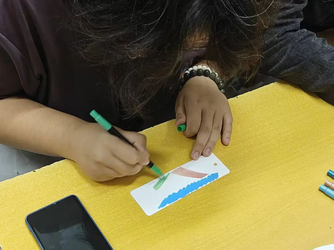 本次活动以“在空白书签上画出在学校发生的印象深刻的事情”为核心环节,引导同学们通过绘画的方式记录自己在校园生活中的感受与成长。每位同学领取一张空白书签和一盒彩色画笔。在主持人的引导下,大家用色彩与线条呈现校园中的难忘瞬间,包括初入校园的兴奋与迷茫,以及与同学、老师共度的温馨时光。创作过程中,同学们或沉思或回忆,作品各具特色:有的展现图书馆窗外的秋日落叶,有的再现课堂上的热烈讨论,还有的以抽象色彩表达从陌生到熟悉的心理变化。小小的书签承载了丰富的情感与故事。