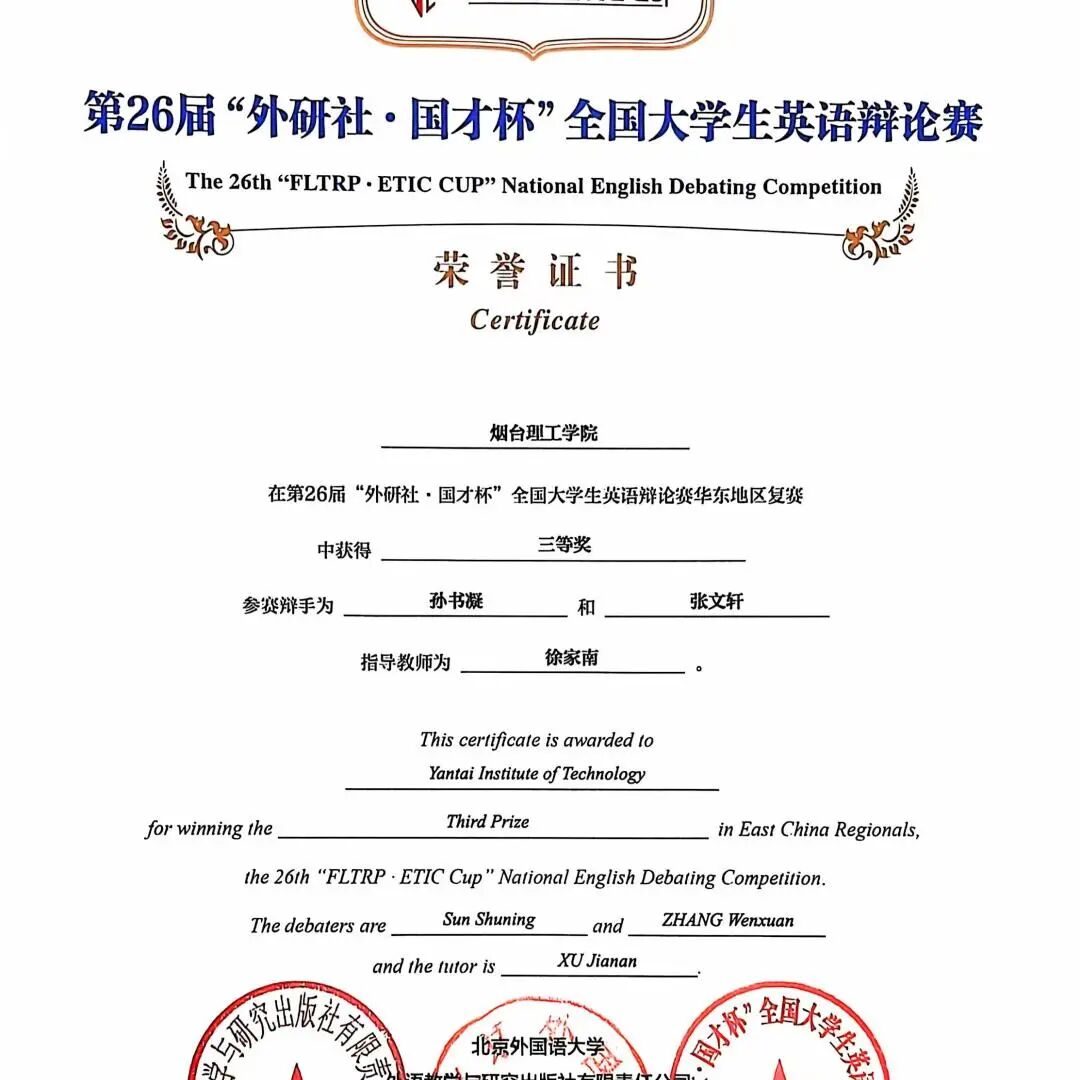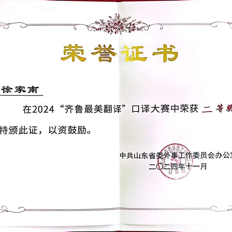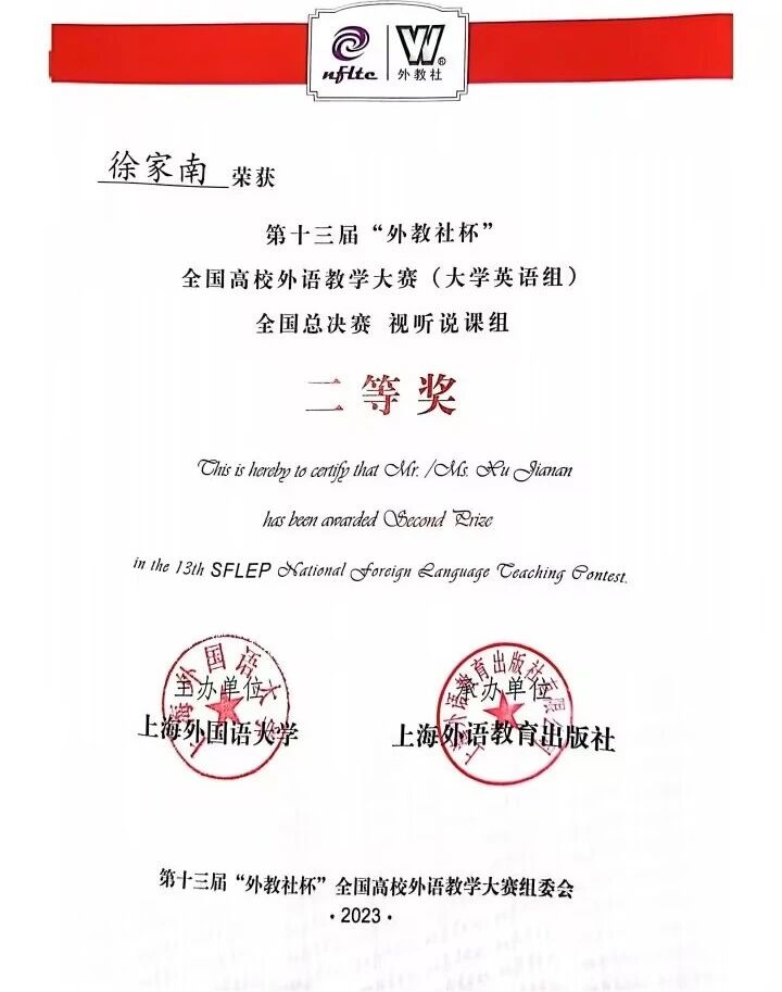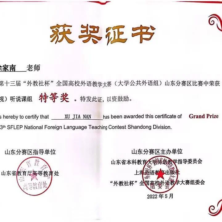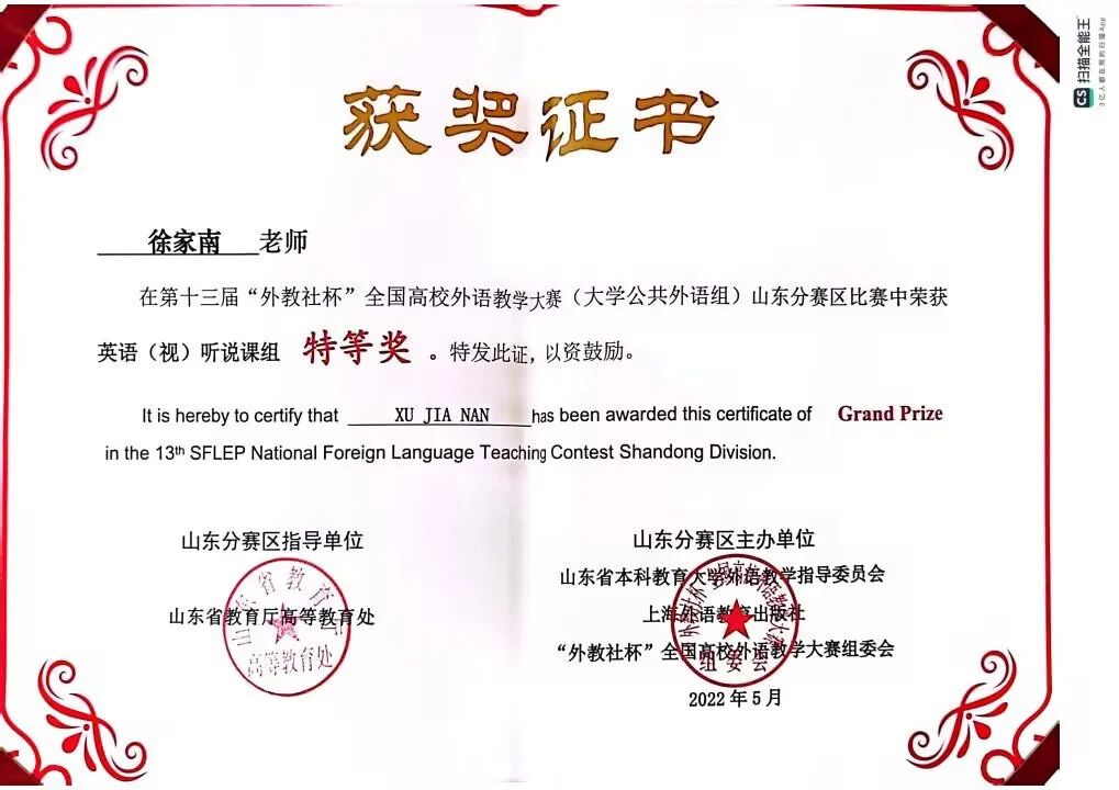 徐家南老师为中共党员,英语专业副教授,系主任,烟台市翻译协会理事,烟台市外语协会副秘书长,2020年毕业于浙江大学,获翻译硕士专业学位,浙江大学国际精英组织人才培养计划荣誉学员。全国翻译资格证书一级笔译、二级口译证书持有者。参与各级教科研项目6项。主讲《基础英语》、《高级英语视听说》、《英语语音语调基础与训练》等课程,曾荣获山东省青教赛一等奖、“21世纪杯全国青年英语演讲比赛”全国总决赛亚军、第十三届“外教社杯”全国高校外语教学大赛“视听说组”山东省特等奖、全国二等奖、“齐鲁最美翻译”口译大赛二等奖。多次指导学生在演讲、辩论、口译比赛中获得国家级、省级奖励。主持山东省艺术科学重点课题一项。