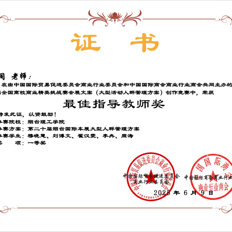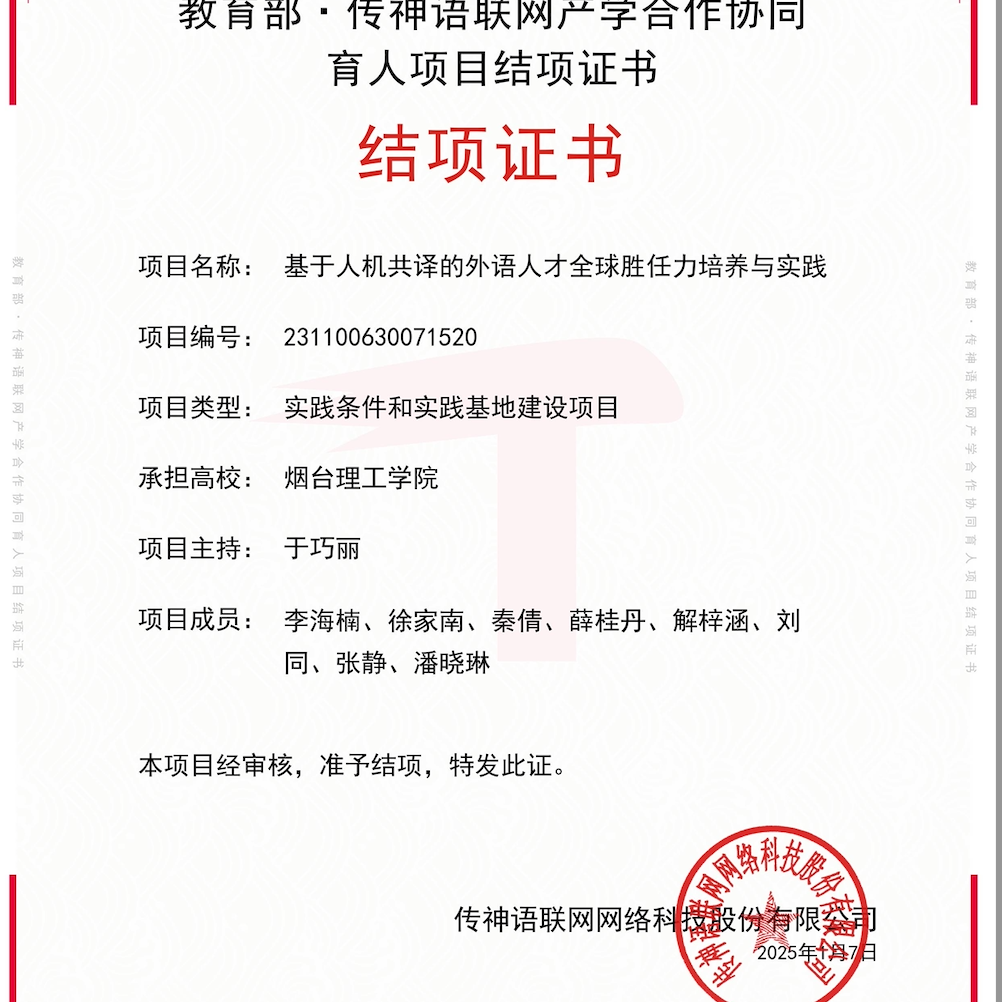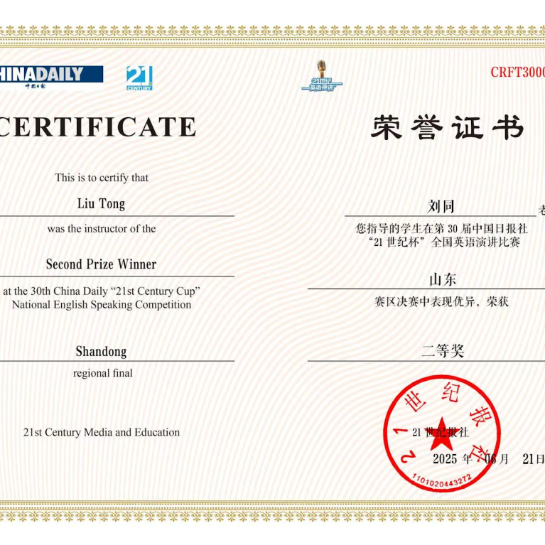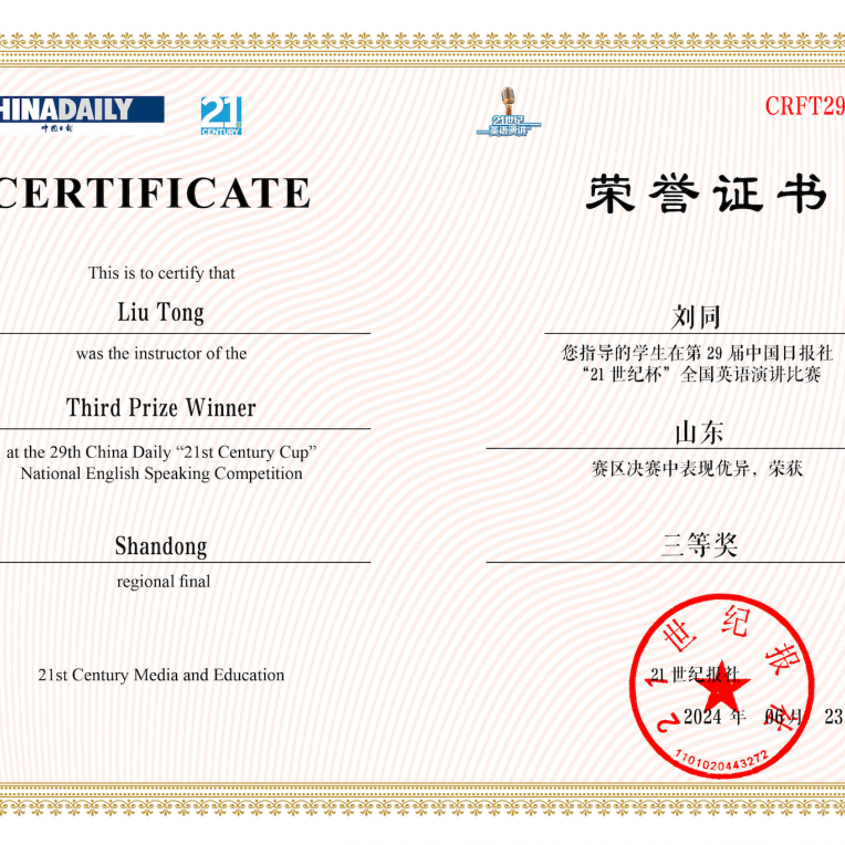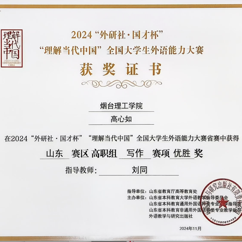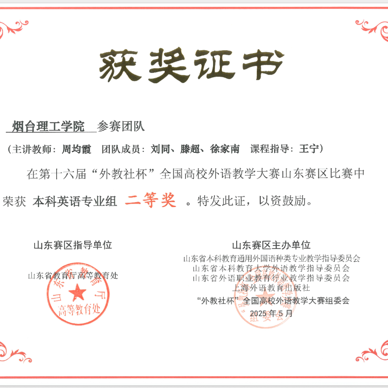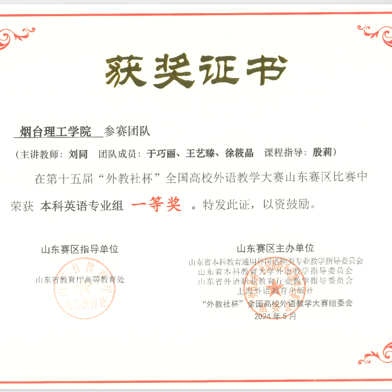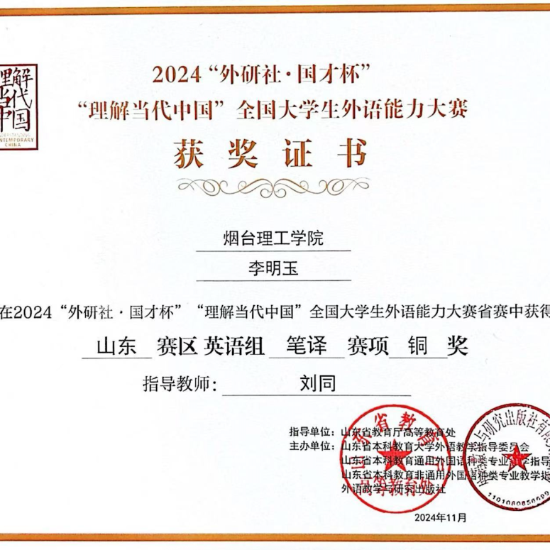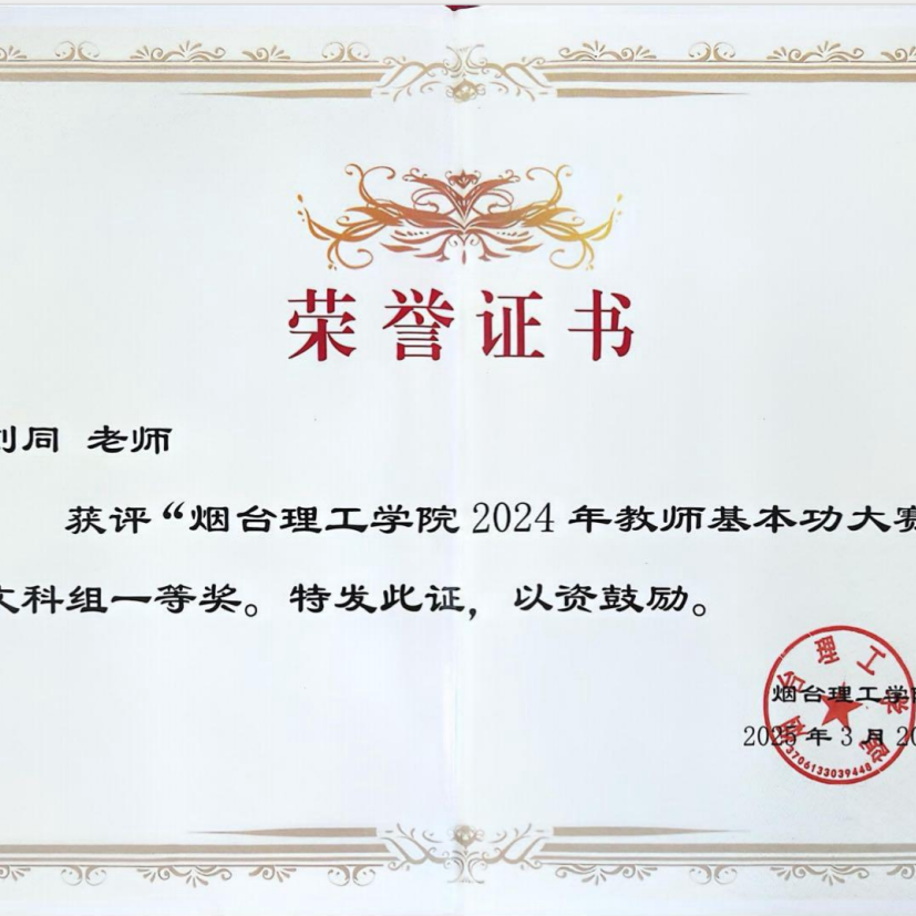 自从事教育事业以来,刘同老师始终秉持着教书育人的理念,尽职尽责地投入到教学工作中。坚持“以学生为中心”,致力于推动外语教学与信息技术的深度融合,提升教学质量和效果。在教学团队支持下,近两年获得教学竞赛奖项6项,包括第十五届“外教社杯”全国高校外语教学大赛山东赛区本科英语专业组一等奖、烟台理工学院教师基本功大赛文科组一等奖、烟台理工学院青年教师教学比赛文科组一等奖等,并与团队共同荣获烟台理工学院教学成果奖一等奖1项,获批应用型暨产教融合型课程1门。积极主持并参与山东省本科高校教学改革研究项目、山东省本科高校教学改革研究项目等教学改革与研究项目8项。秉持“赛教融合、持续改进”的理念,积极开展学科竞赛工作,近两年指导学生获得省级及以上奖项10余项,包括第八届全国高校大学生外语水平能力大赛(英语本科组)特等奖、第30届中国日报社“21世纪杯”全国英语演讲比赛山东赛区决赛二等奖等。积极参加教育教学相关培训,对教学工作进行总结,发表论文1篇。2024年年度考核与师德师风考核均评为“优秀”,深受学生喜爱。