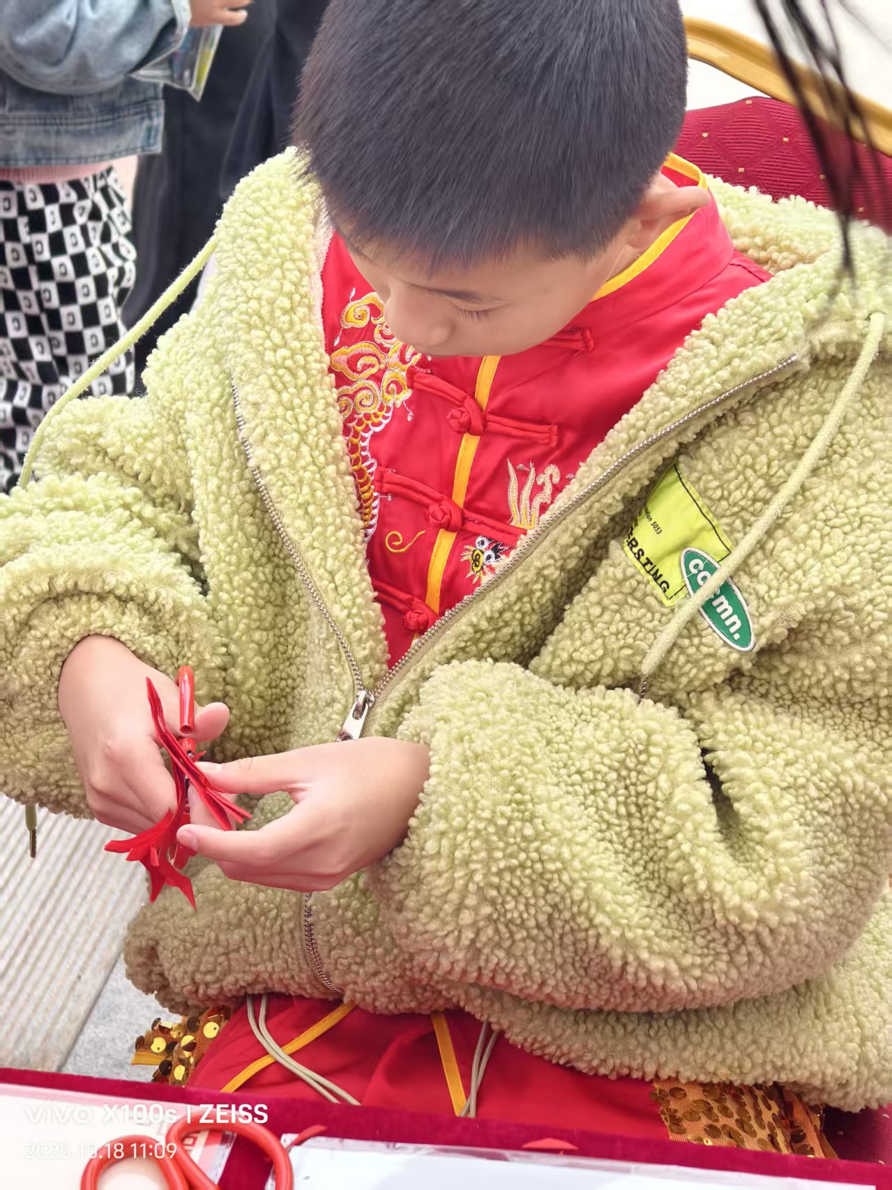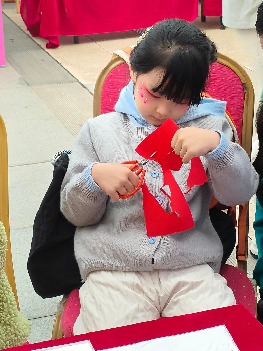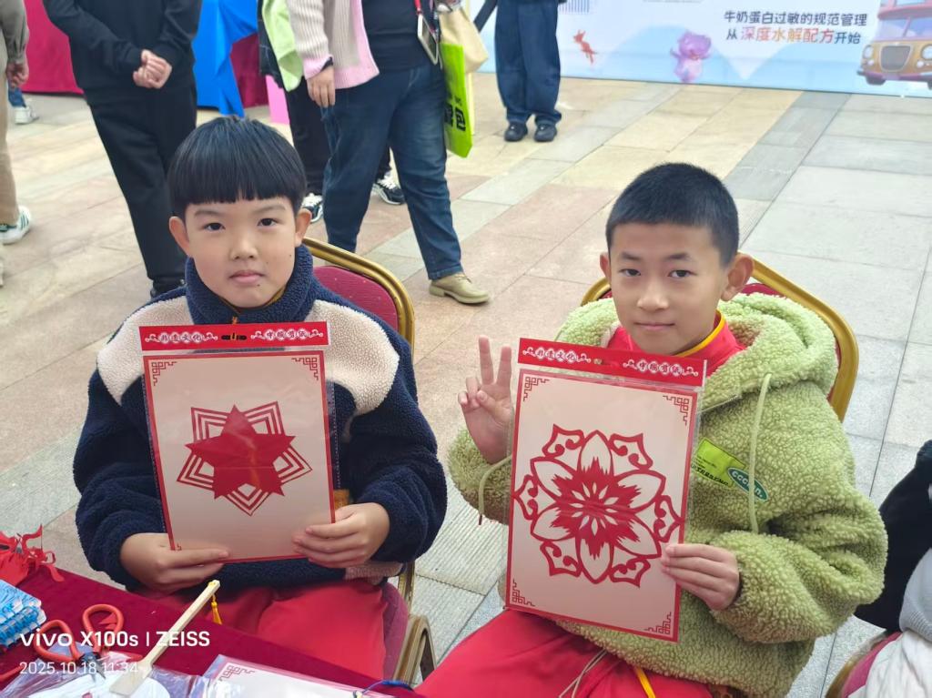 为助力生育友好文化节打造特色文化场景,同时助力非遗文化的传承,剪艺志愿服务队在活动现场开展了生动的剪纸艺术教学。志愿者们化身“非遗传承人”,先以通俗易懂的语言向参与儿童讲解剪纸文化的历史渊源与民俗价值,帮助孩子们建立对传统剪纸艺术的认知;随后分步进行现场示范,针对孩子们的操作难点进行手把手指导,并耐心解答各类疑问。孩子们全程专注投入,紧握剪刀跟随节奏认真操作。当普通红纸逐渐变身可爱的小动物、灵动的花朵时,孩子们脸上满是惊喜与成就感。现场的剪刀声、欢笑声与秋日暖阳交相辉映,氛围格外温馨。剪艺志愿服务队通过一系列教学,让孩子们在实践中深度感受非遗魅力,既为生育友好文化节增添了文化底蕴,也有效推动了剪纸艺术在青少年群体中的传承和发展。
