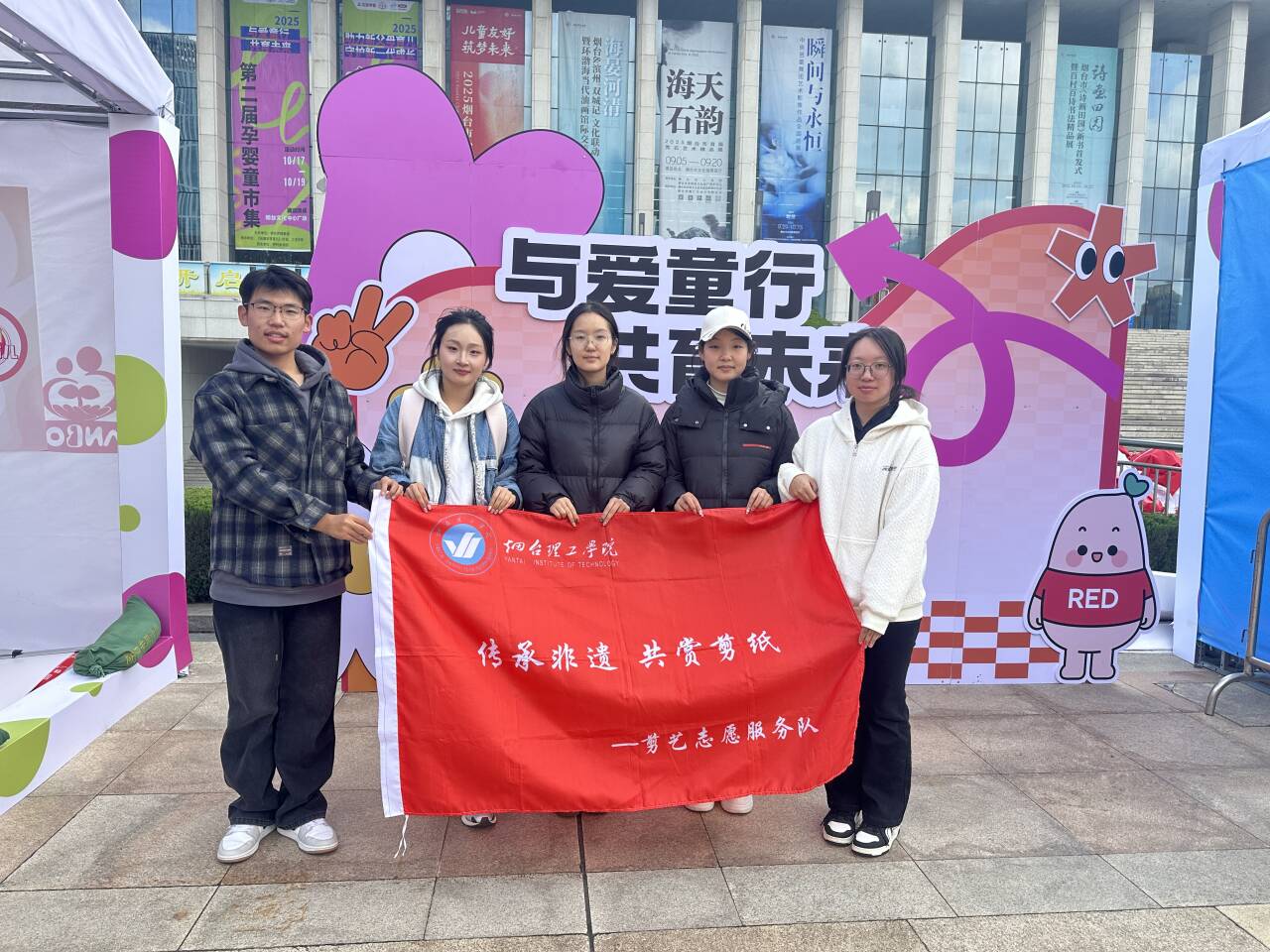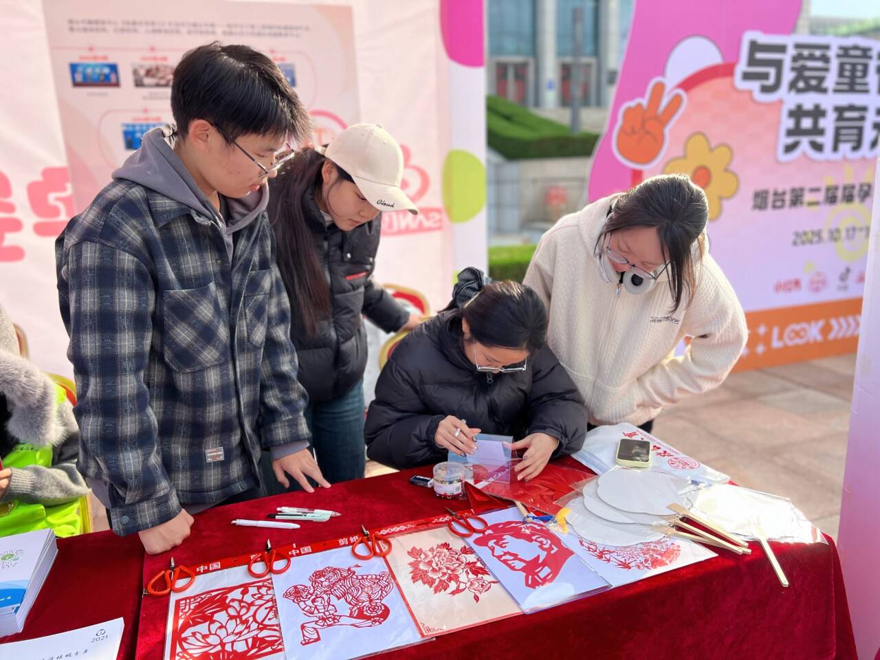 10月18日至19日,外国语学院剪艺志愿服务队应邀参加“与爱‘童’行· 共‘育’未来”暨烟台第一届生育友好文化节,开展非遗剪纸艺术体验活动。本次活动由烟台传媒集团主办,联合烟台市卫生健康委员会、烟台市妇联、芝罘区委社会工作部等单位共同推动。
