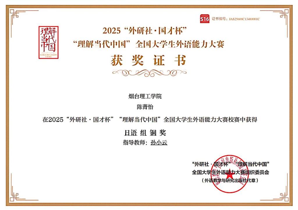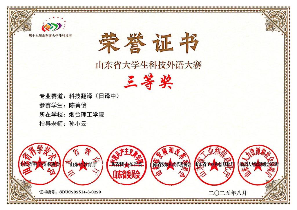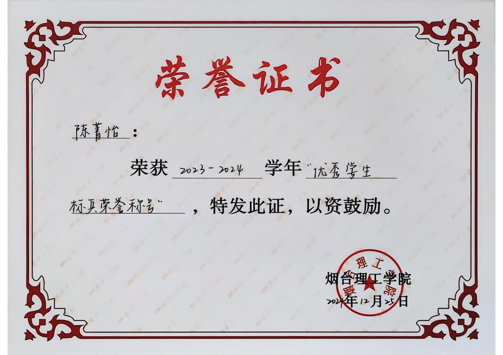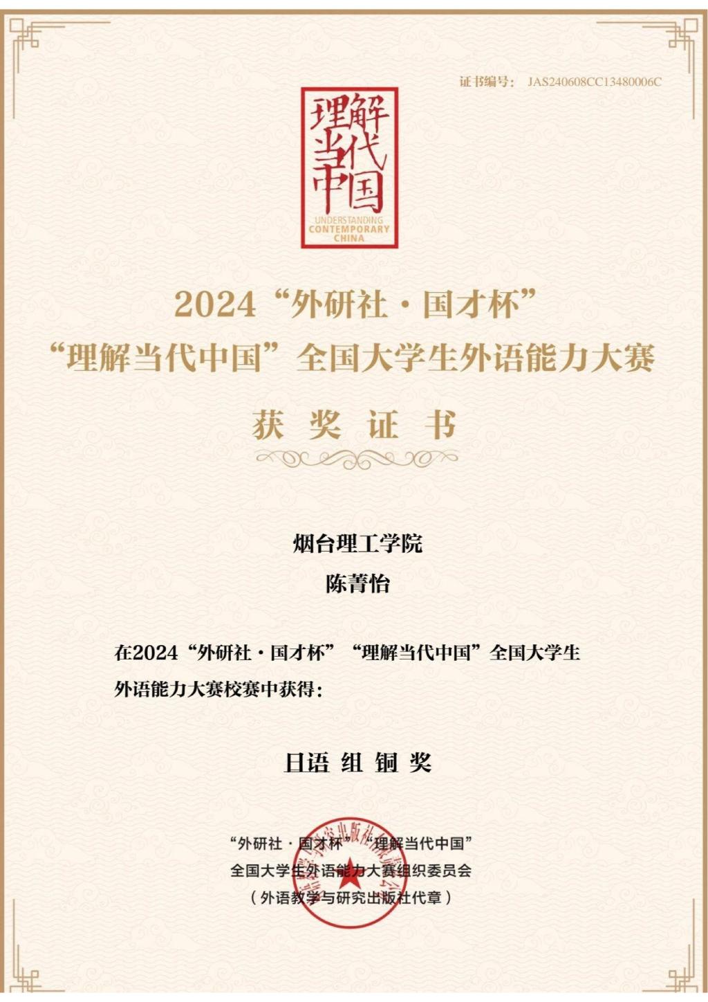 陈菁怡,烟台理工学院外国语学院2023级日语专业学生,现任外2303-1班团支书。曾获得2024年烟台理工学院琴心之辩辩论赛冠军;2023--2024学年中被评选为“”优秀共青团干部”;“外研社-国才杯”理解当代中国全国大学生外语能力大赛校级铜奖;日本语能力测试N2证书;烟台理工学院2023-2024“社会公益先进个人”;烟台理工学2023-2024学年祥隆奖学金;2023-2024学年,荣获烟台理工学院“优秀学生标兵”荣誉称号;全国高校商业精英挑战赛国际贸易竞赛“敏学杯”山东省总决赛二等奖;获得2025年烟台理工学院琴心之辩辩论赛“亚军”;外国语学院团总支 2024年度共青团优秀共青团干部荣誉称号;全国高校商业精英挑战赛文旅与会展创新创业实践竞赛山东省总决赛中荣获二等奖;山东省大学生科技外语大赛科技翻译(日译中)三等奖;山东省大学生科技外语大赛科技翻译(中译日)三等奖;“外研社-国才杯”理解当代中国全国大学生外语能力大赛校级铜奖;全国高校商业精英挑战赛创新创业竞赛营销模拟决策赛道山东省级总决赛二等奖;2024-2025学年获得烟台理工学院“优秀学生标荣誉称号”。