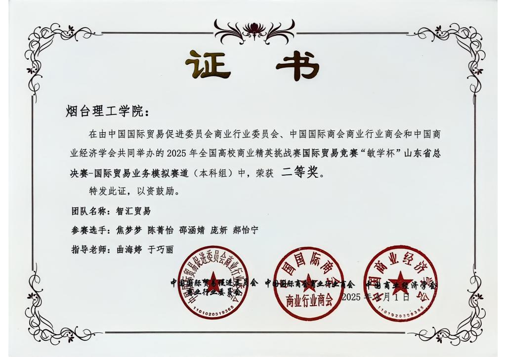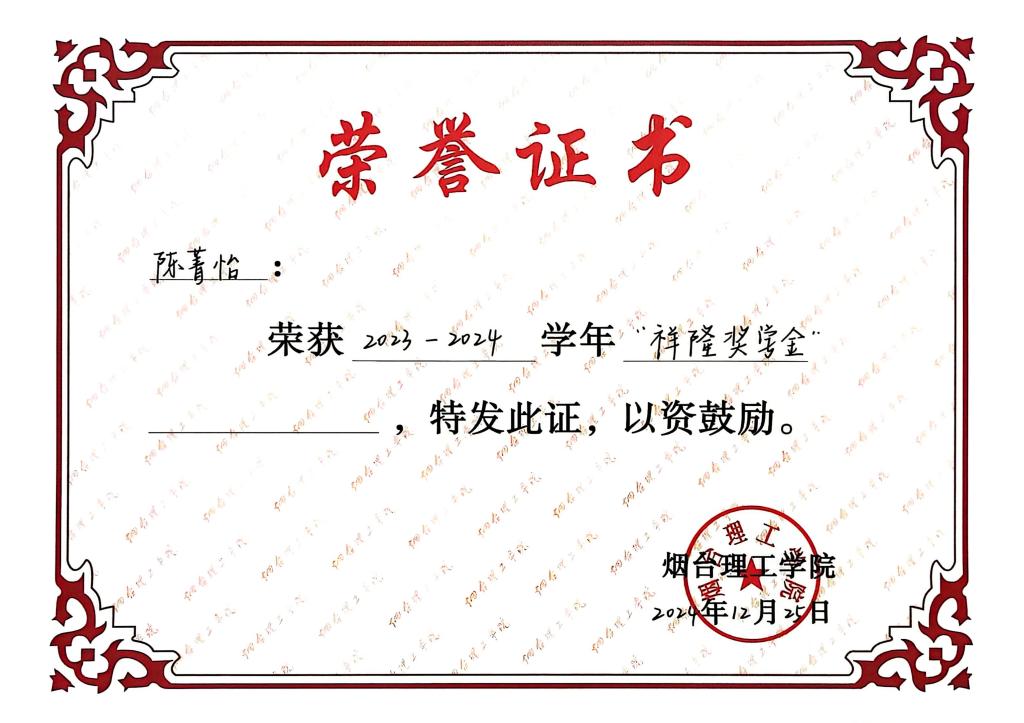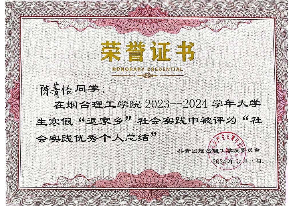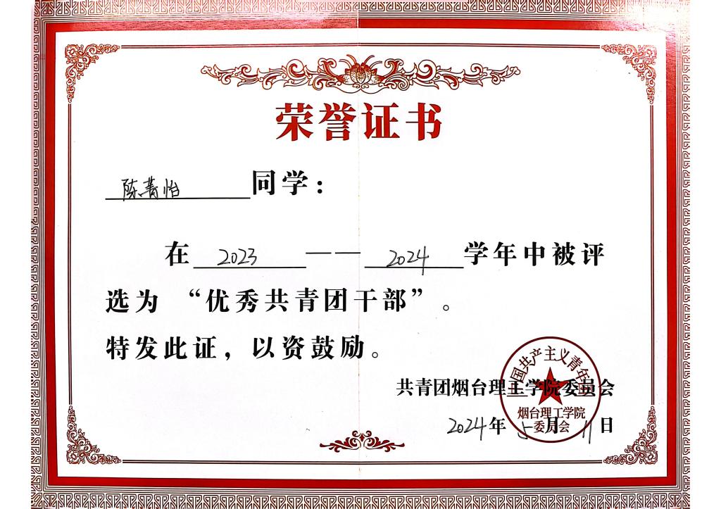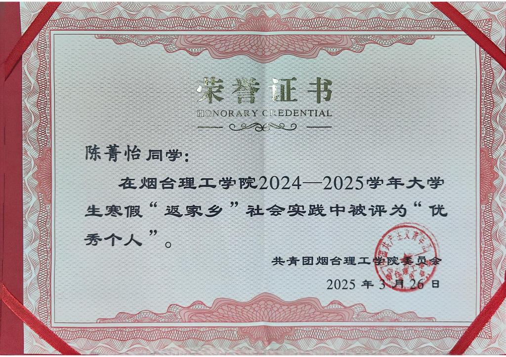 陈菁怡,烟台理工学院外国语学院2023级日语专业学生,现任外2303-1班团支书。曾获得2024年烟台理工学院琴心之辩辩论赛冠军;2023--2024学年中被评选为“”优秀共青团干部”;“外研社-国才杯”理解当代中国全国大学生外语能力大赛校级铜奖;日本语能力测试N2证书;烟台理工学院2023-2024“社会公益先进个人”;烟台理工学2023-2024学年祥隆奖学金;2023-2024学年,荣获烟台理工学院“优秀学生标兵”荣誉称号;全国高校商业精英挑战赛国际贸易竞赛“敏学杯”山东省总决赛二等奖;获得2025年烟台理工学院琴心之辩辩论赛“亚军”;外国语学院团总支 2024年度共青团优秀共青团干部荣誉称号;全国高校商业精英挑战赛文旅与会展创新创业实践竞赛山东省总决赛中荣获二等奖;山东省大学生科技外语大赛科技翻译(日译中)三等奖;山东省大学生科技外语大赛科技翻译(中译日)三等奖;“外研社-国才杯”理解当代中国全国大学生外语能力大赛校级铜奖;全国高校商业精英挑战赛创新创业竞赛营销模拟决策赛道山东省级总决赛二等奖;2024-2025学年获得烟台理工学院“优秀学生标荣誉称号”。