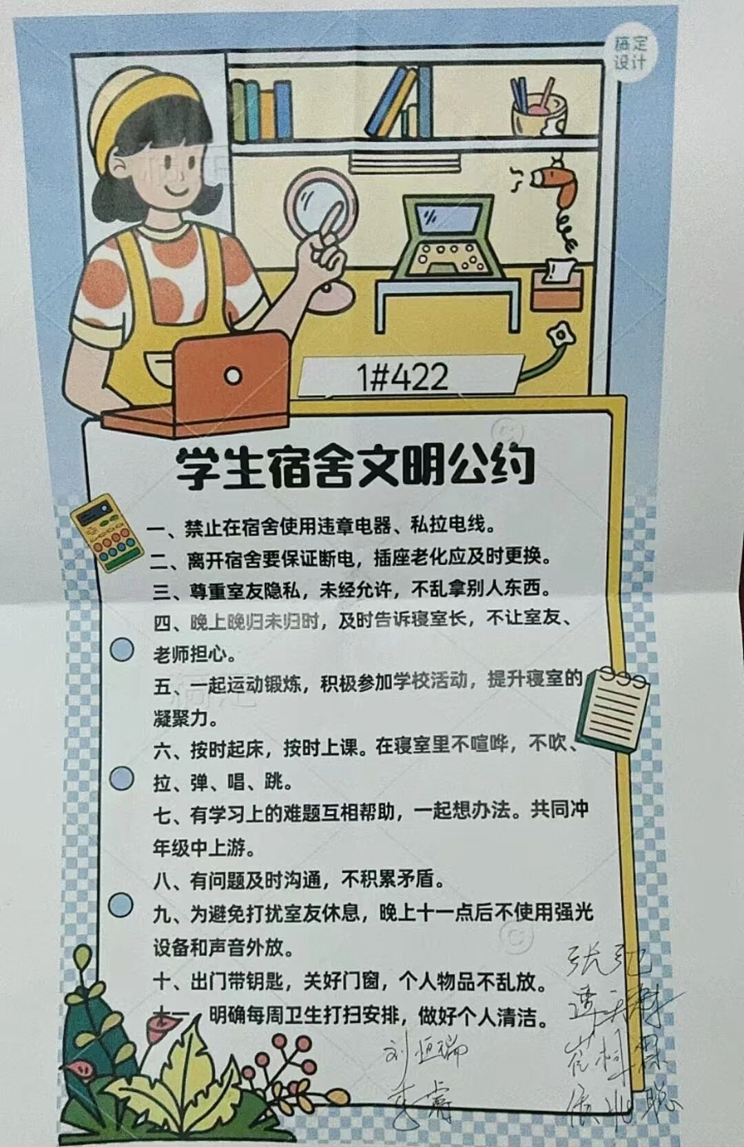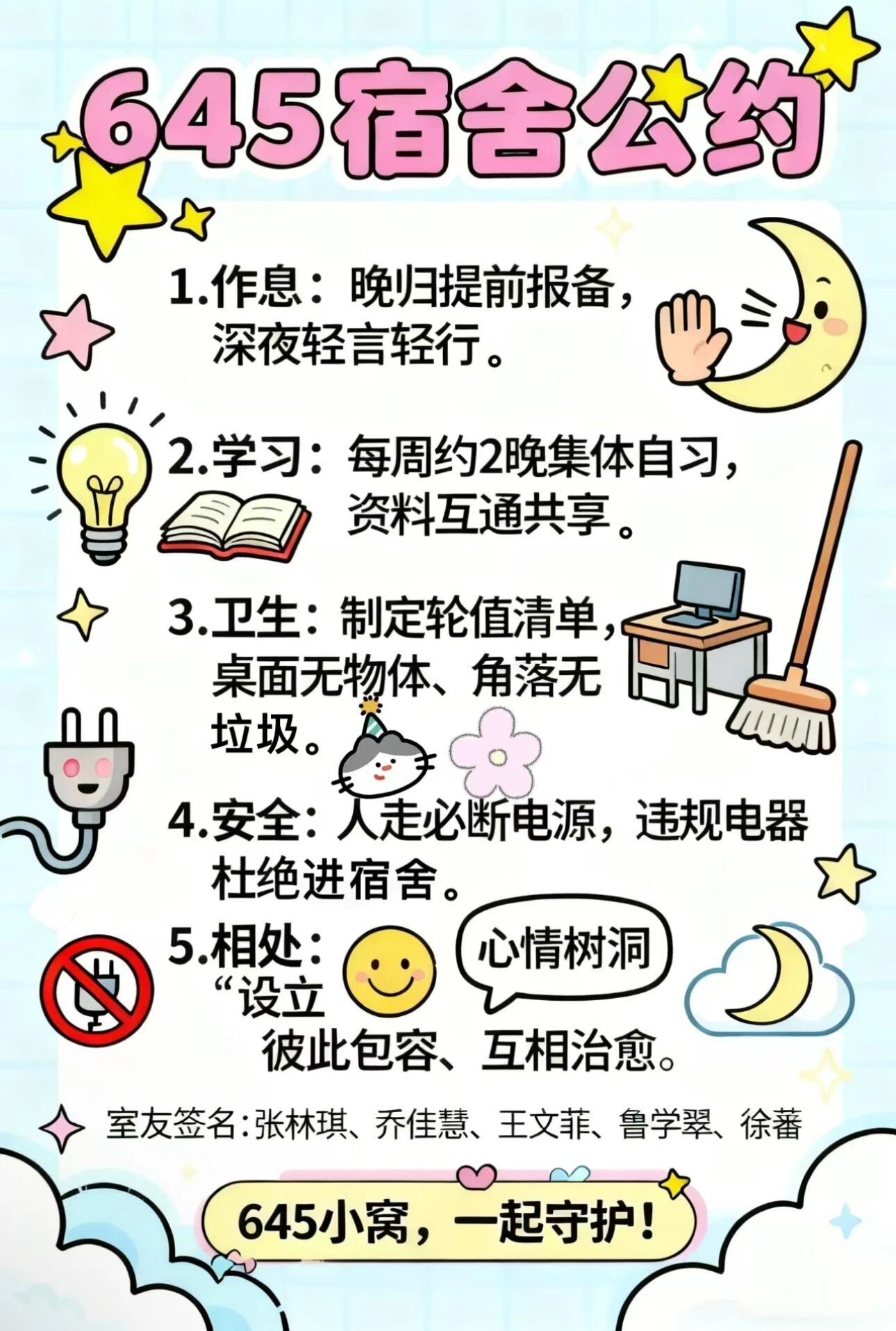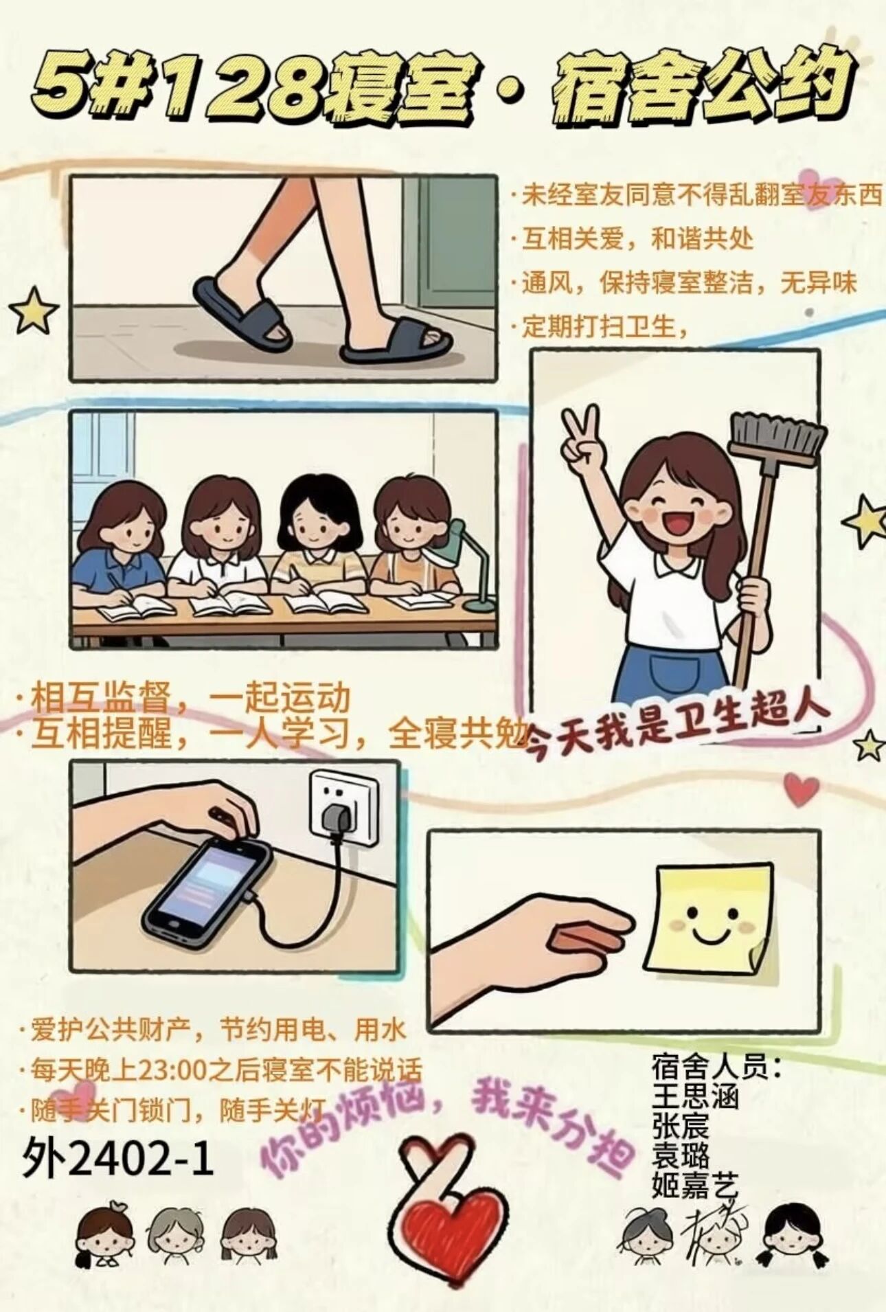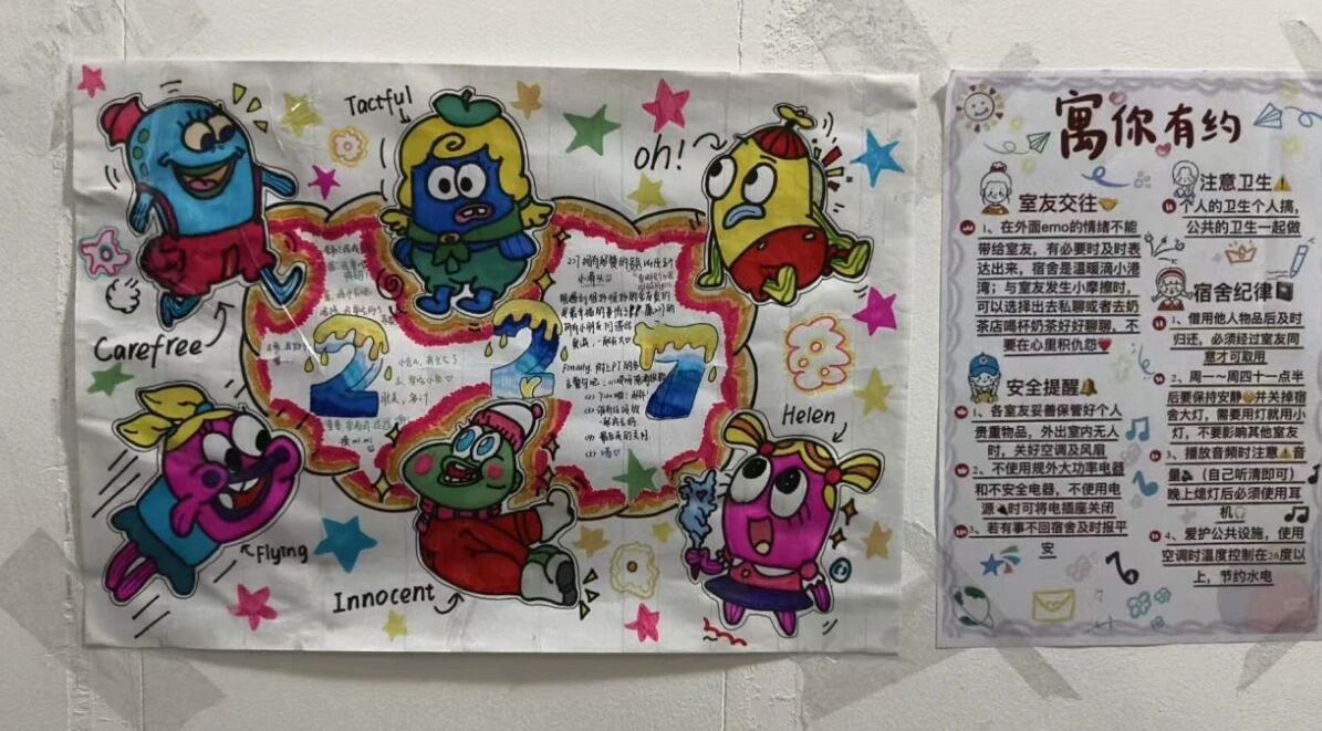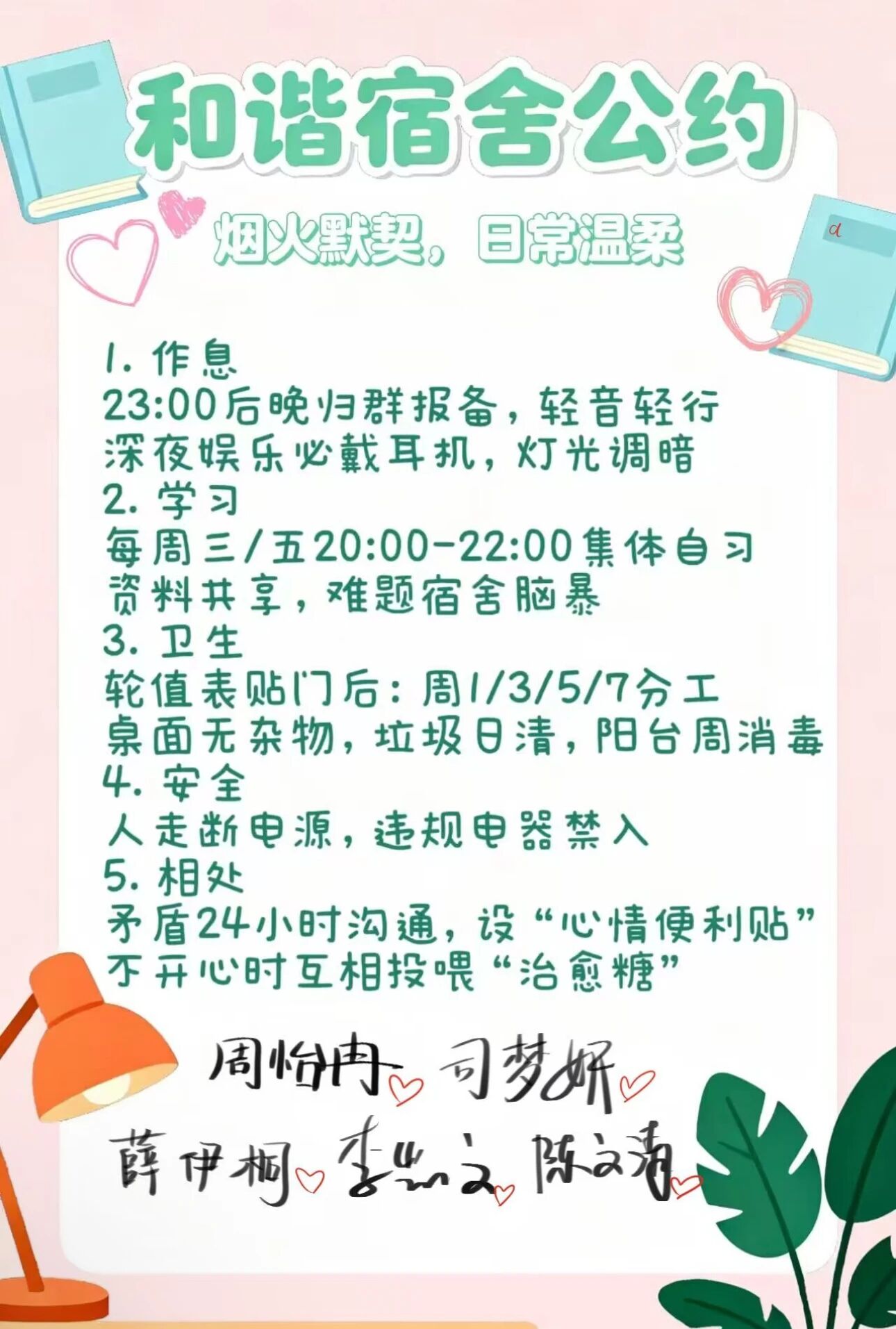 各宿舍通过集体讨论,围绕作息制度、环境维护、安全防控及人际和谐等维度,制定了兼具规范性与可行性的宿舍行为准则。同学们充分发挥创意才能,以手绘艺术、视觉设计等多元形式,创作出一系列主题鲜明、形式新颖的公约展示作品。公约正式确立后,各宿舍将其张贴于室内公共区域,有效引导同学们将公约精神融入日常实践,在持续践行中强化规则意识、提升文明素养,共同营造和谐有序的居住环境。