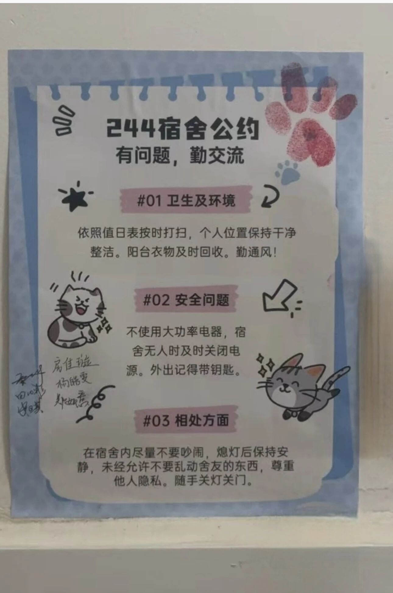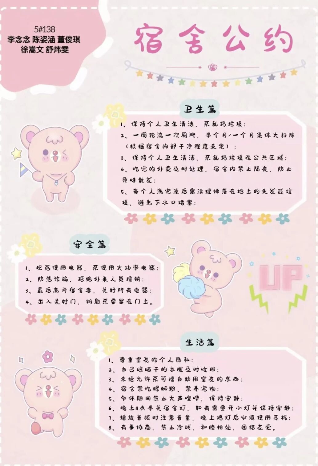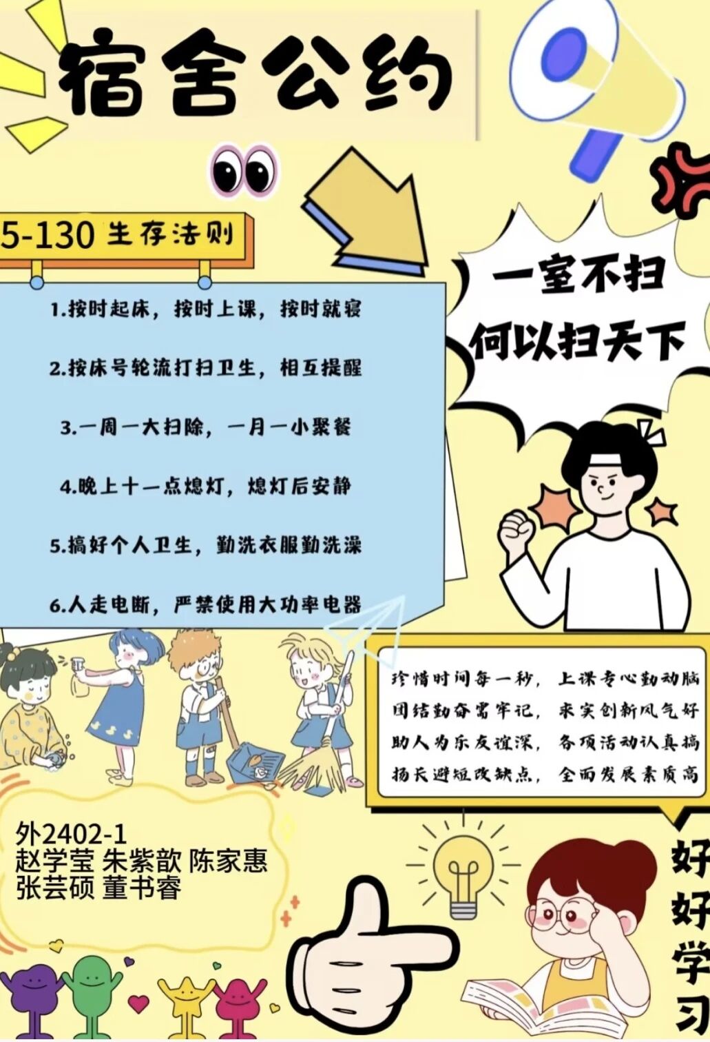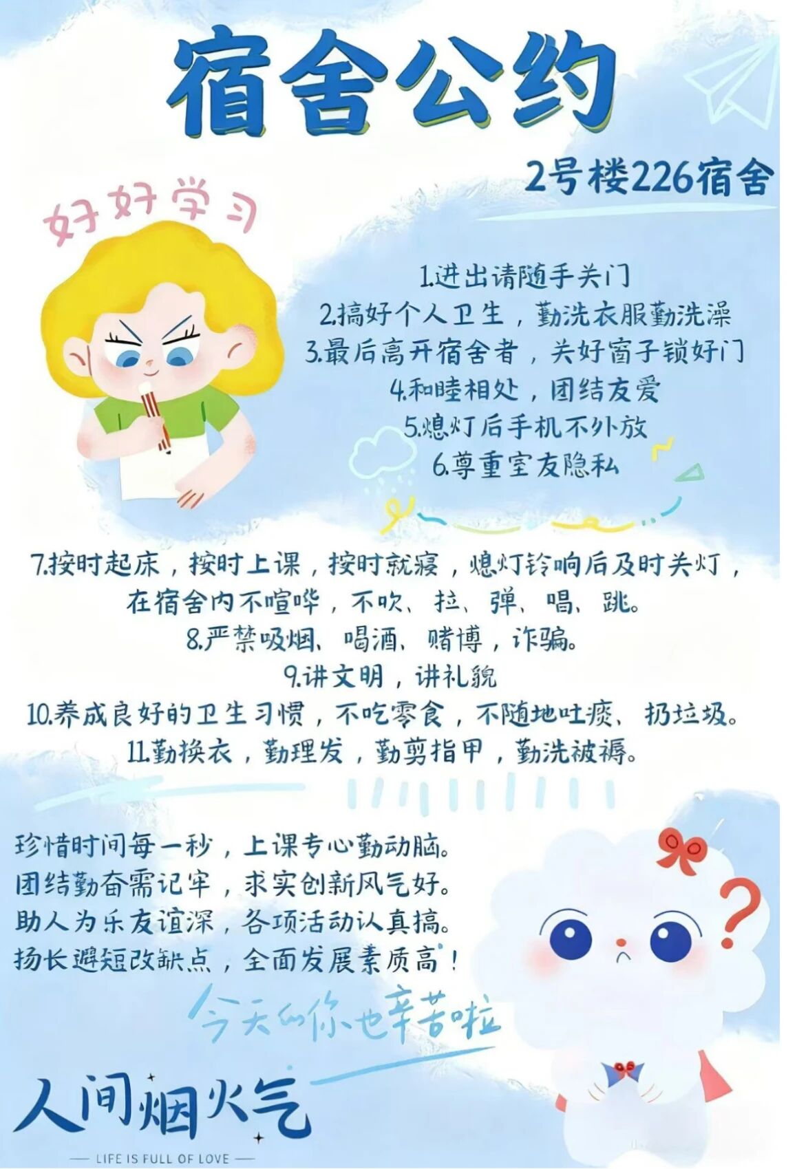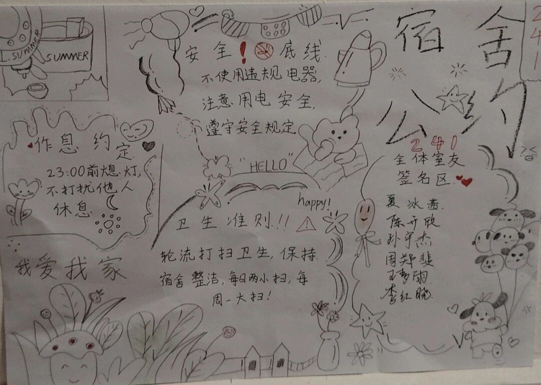 各宿舍通过集体讨论,围绕作息制度、环境维护、安全防控及人际和谐等维度,制定了兼具规范性与可行性的宿舍行为准则。同学们充分发挥创意才能,以手绘艺术、视觉设计等多元形式,创作出一系列主题鲜明、形式新颖的公约展示作品。公约正式确立后,各宿舍将其张贴于室内公共区域,有效引导同学们将公约精神融入日常实践,在持续践行中强化规则意识、提升文明素养,共同营造和谐有序的居住环境。