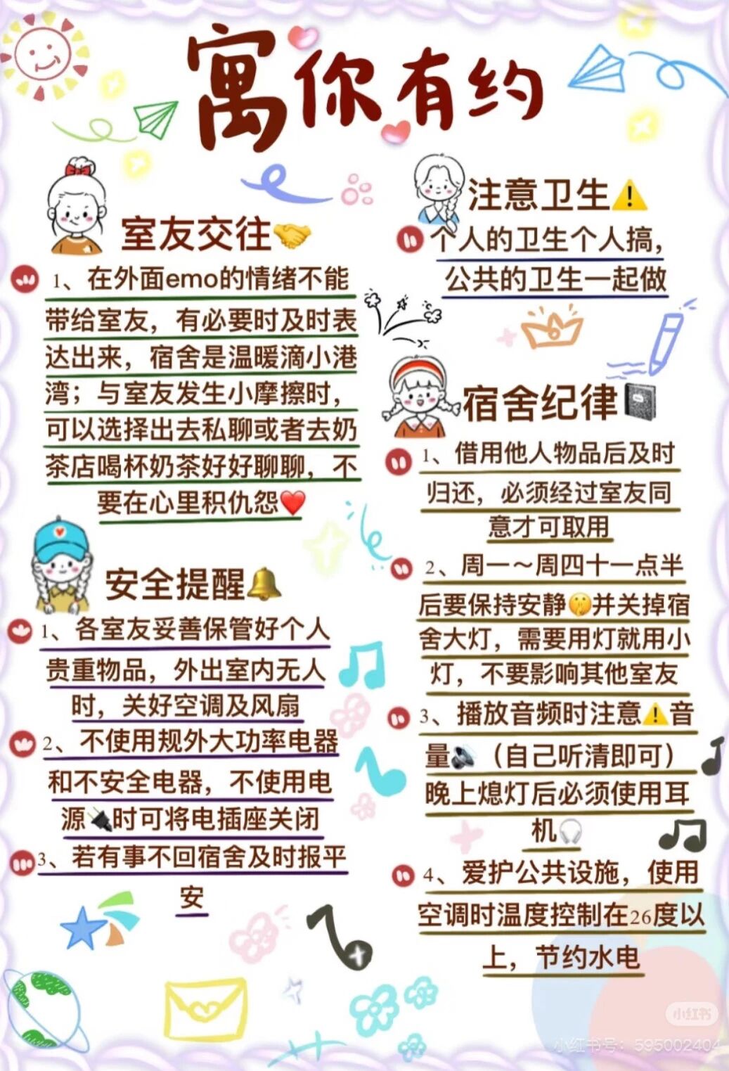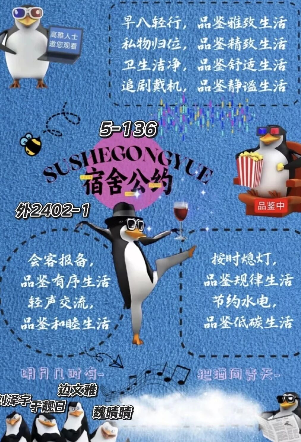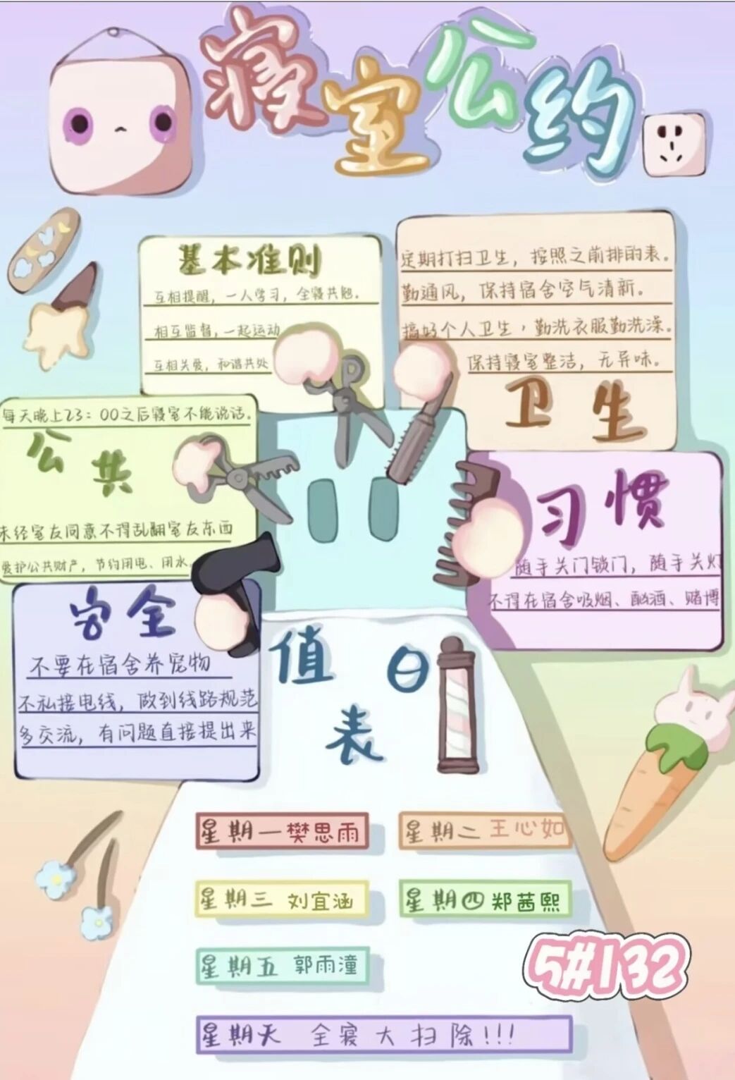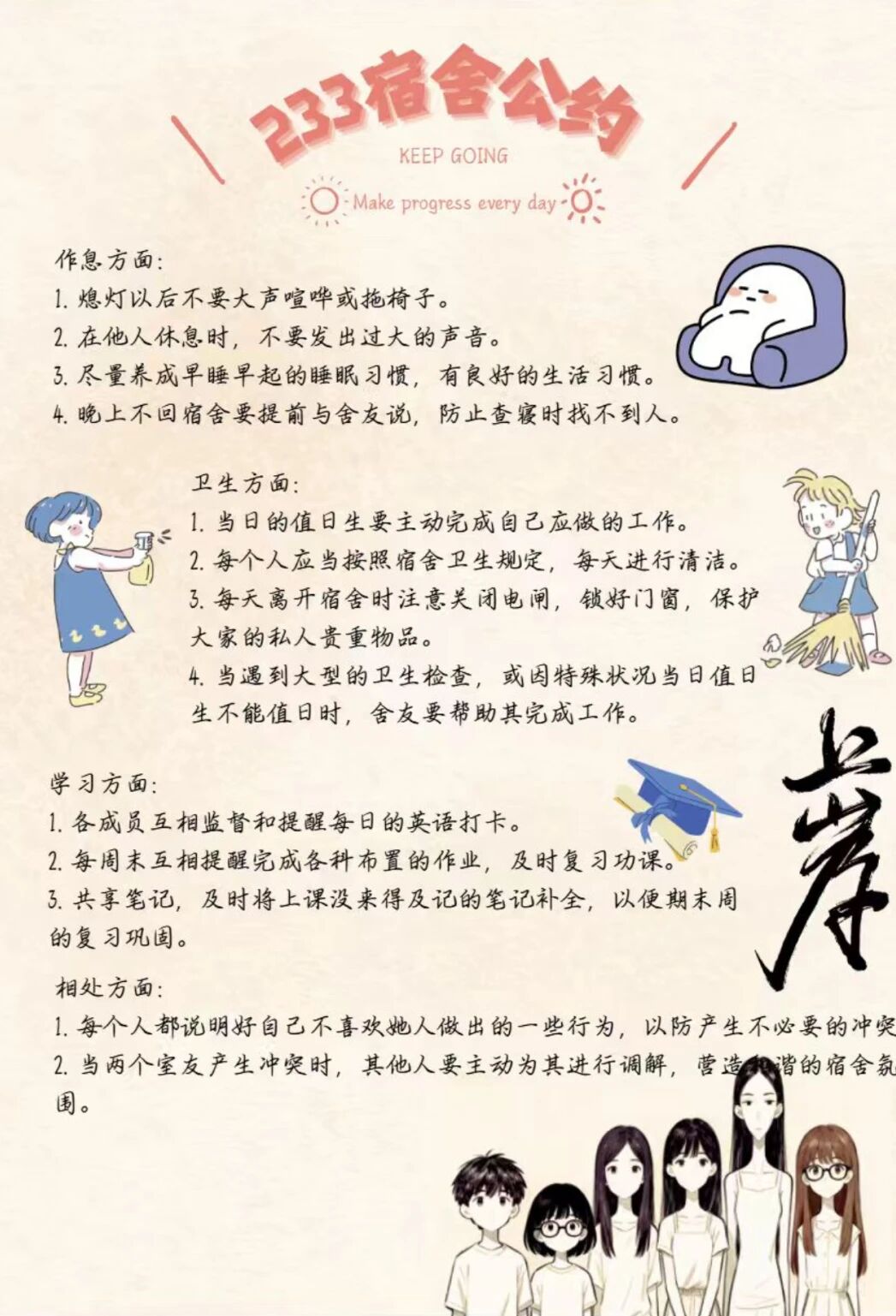 各宿舍通过集体讨论,围绕作息制度、环境维护、安全防控及人际和谐等维度,制定了兼具规范性与可行性的宿舍行为准则。同学们充分发挥创意才能,以手绘艺术、视觉设计等多元形式,创作出一系列主题鲜明、形式新颖的公约展示作品。公约正式确立后,各宿舍将其张贴于室内公共区域,有效引导同学们将公约精神融入日常实践,在持续践行中强化规则意识、提升文明素养,共同营造和谐有序的居住环境。