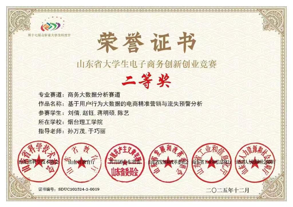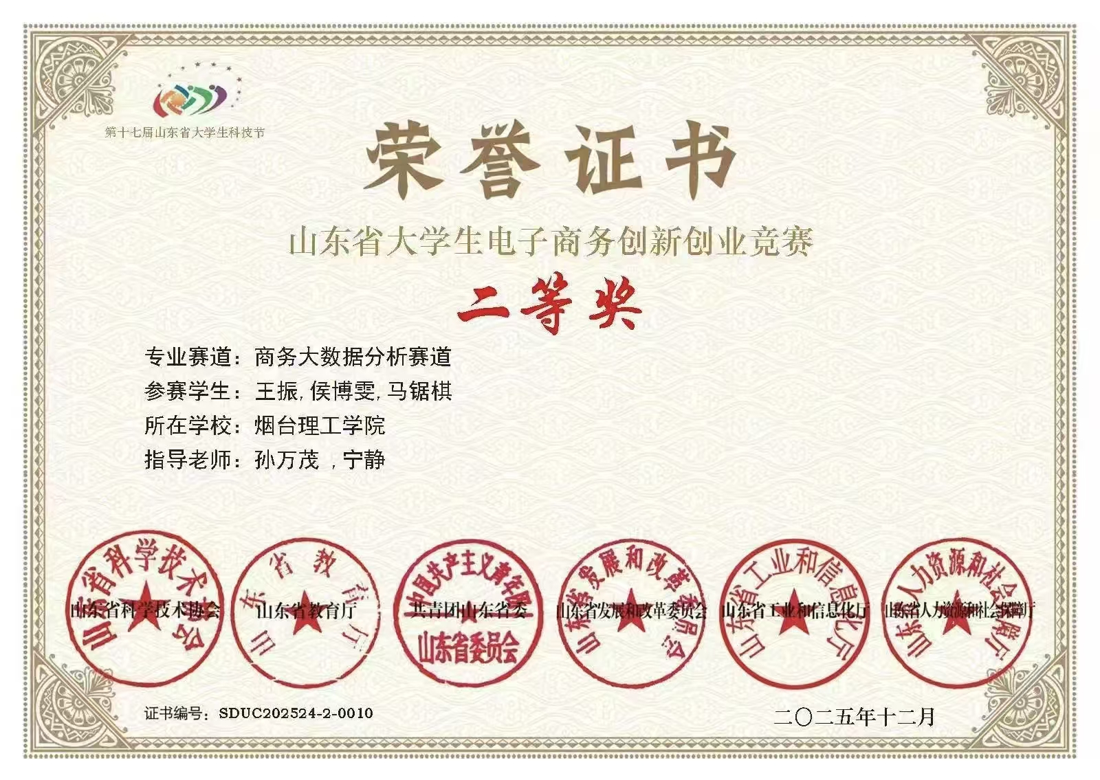 近日,第十七届山东省大学生科技节・山东省大学生电子商务创新创业竞赛落下帷幕,烟台理工学院外国语学院学子在商务大数据分析赛道中凭借“外语 + 数智”的复合型能力,一举斩获两项省级二等奖,成为学院深化数智化人才培养模式的又一亮眼成果。