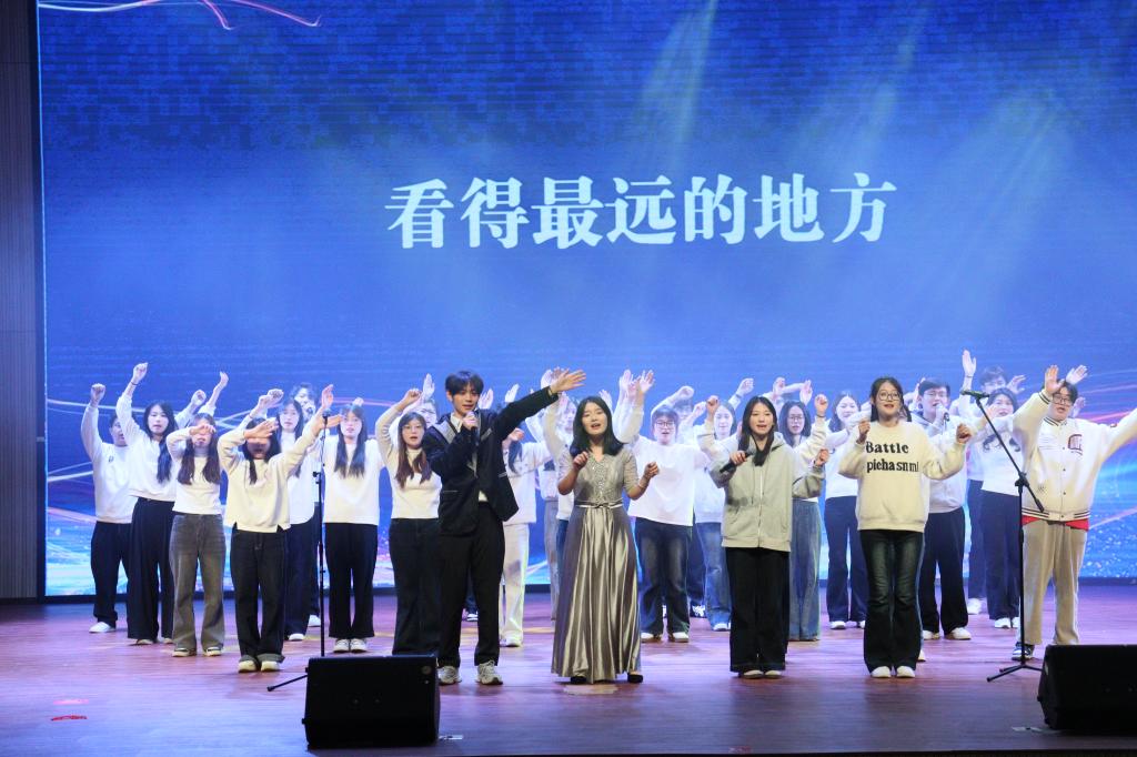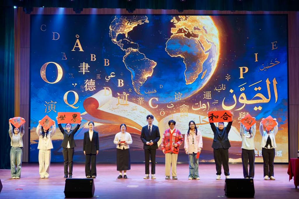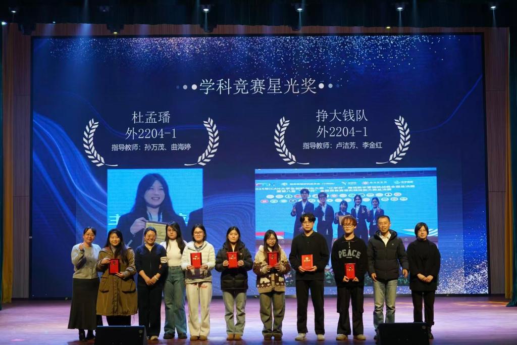 活动以一名大一新生的视角为主线,通过“星光”“路途”“世界”三个篇章,生动呈现其从入学启航、实践求索到放眼世界的成长轨迹。首先,外国语学院院长致辞,回顾外语嘉年华的品牌积淀与育人成效,勉励同学们夯实专业基础、拓展国际视野,主动担当时代使命。随后,舞蹈表演《Killin It Girl》正式拉开活动帷幕。“星光”篇章聚焦学生成长荣光,先后上演新生报到情景剧、歌曲《裹着心的光》,并集中颁发优秀社会实践团队足迹奖、学风建设优秀班集体同行奖、优秀学生干部星火奖、外语嘉年华系列活动优秀个人致远奖、学科竞赛追光奖、学科竞赛星光奖、学科竞赛特别贡献烽火奖等多项荣誉。在随后的《星光访谈》中,四位优秀学子分享了学科竞赛中的挫折与坚守,向同学们传递了“不畏困难、突破自我”的奋斗信念。“路途”篇章展现实践成长,通过情景剧引出商务英语竞赛展示,该展示呈现了从课题构思、团队协作到成果答辩的全过程,搭配歌曲《我变了我没变》及各类学科竞赛获奖视频,直观展现了学科竞赛的实践价值与育人内涵。“世界”篇章在《Golden Hour》的旋律中开启,朗诵“语通世界”既展现出多语种文化交融的魅力,又聚焦外语在国际传播、国际绿色发展合作和人工智能时代发展中的重要作用;校友祝福视频送来暖心寄语。最后,外语嘉年华在大合唱《看得最远的地方》中圆满落幕。