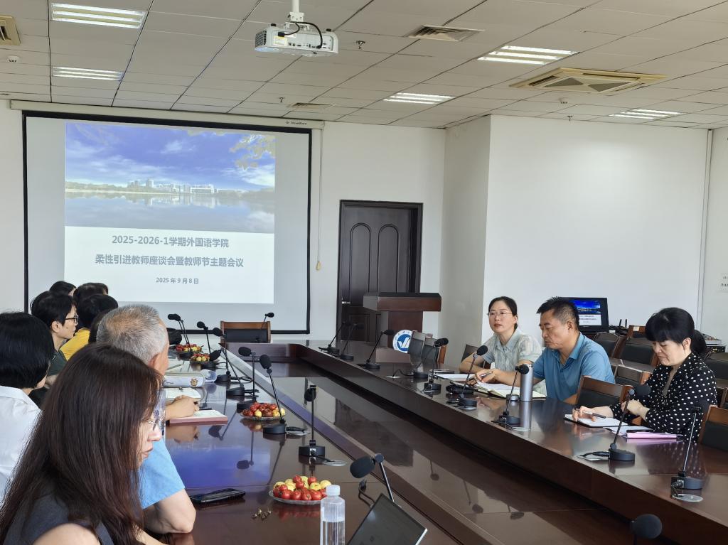 为充分发挥柔性引进人才在学科专业建设、教学改革中的智力支撑作用,搭建高效沟通平台以凝聚发展共识,在第 41 个教师节来临之际,外国语学院召开新学期柔性引进教师座谈会。学院领导班子及全体柔性引进教师参会,围绕教学科研反馈、能力提升路径、未来发展规划三大议题深入研讨,为学院高质量发展注入智慧动能。