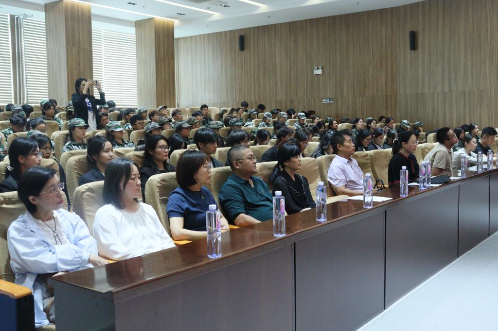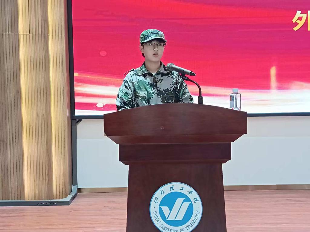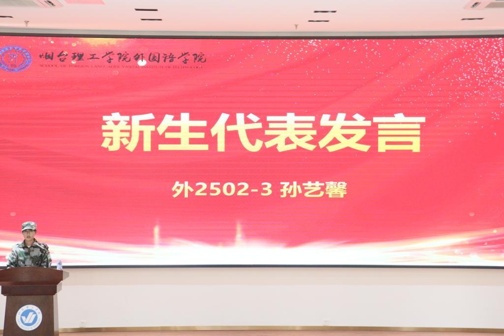 随后,老生代表杜孟璠分享了自己的大学成长故事,结合外语专业学习经历,她建议新生同学们“以勤为径探索语言之美,以思为舟感悟文化之韵”,主动参与学术研讨、社会实践,在多元历练中成长为“融通中外、知行合一”的新时代外语人才。新生代表孙艺馨表达了对大学生活的憧憬,她表示被校园严谨学风与温暖氛围打动,也在军训中体会到“团结”与“坚韧”。作为外语专业新生,她将以军训意志为基,夯实语言功底、锤炼跨文化能力,努力成为“讲好中国故事、传递世界声音”的学习者,并代表新生承诺将保持热忱与谦逊,尊重师长、友爱同窗。