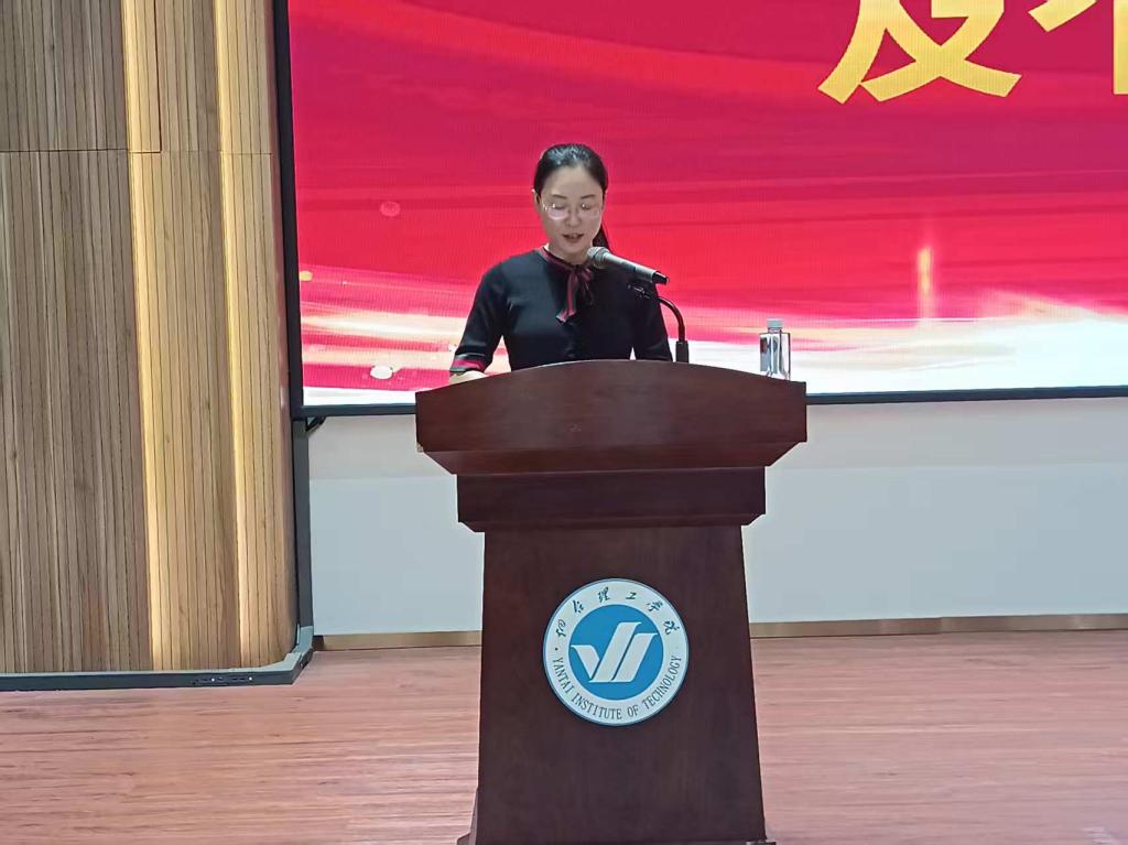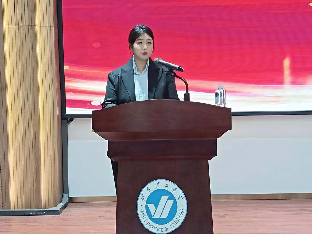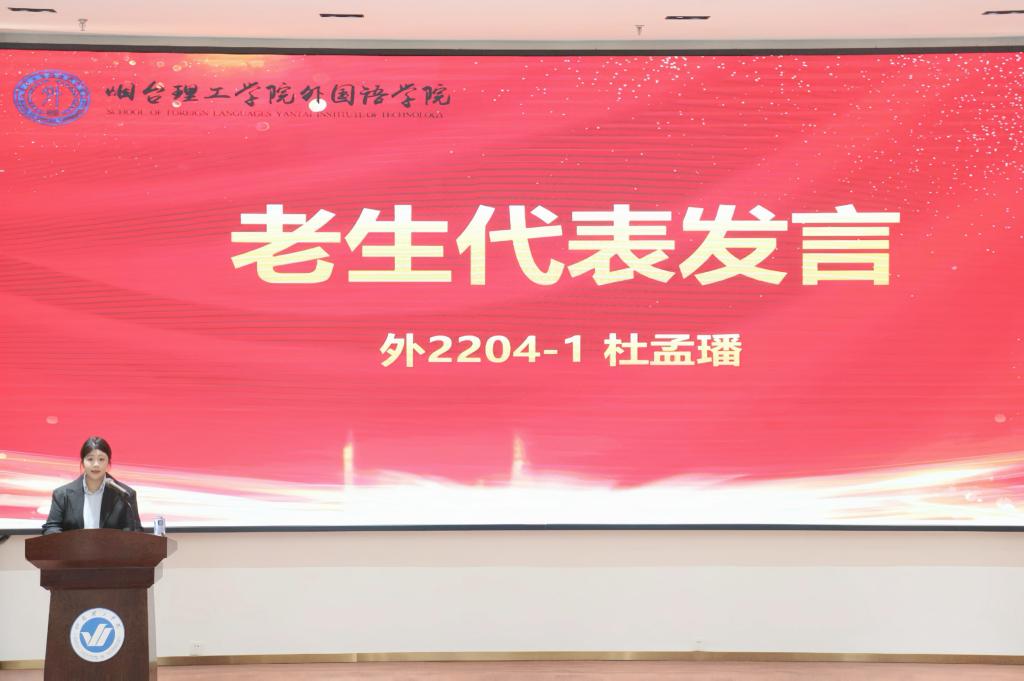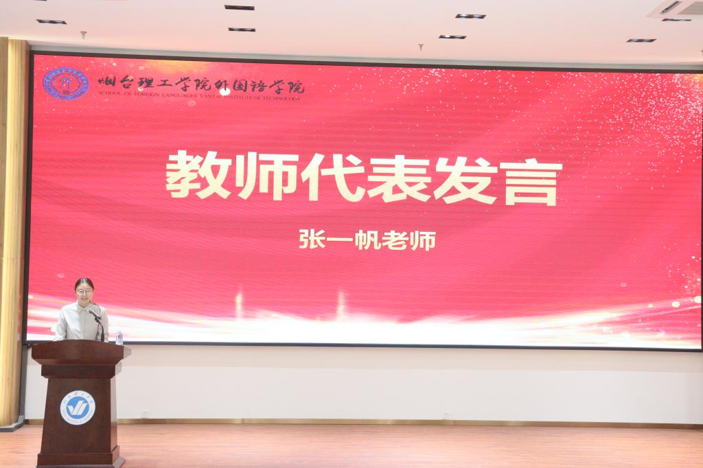 在庄严的国歌声中,大会正式拉开帷幕。教师代表张一帆首先上台发言,以教育者的热忱,鼓励同学们在大学时光里深耕专业、拓宽视野,在语言学习中架起沟通世界的桥梁,在文化交融中涵养家国情怀,以实干精神书写青春答卷。