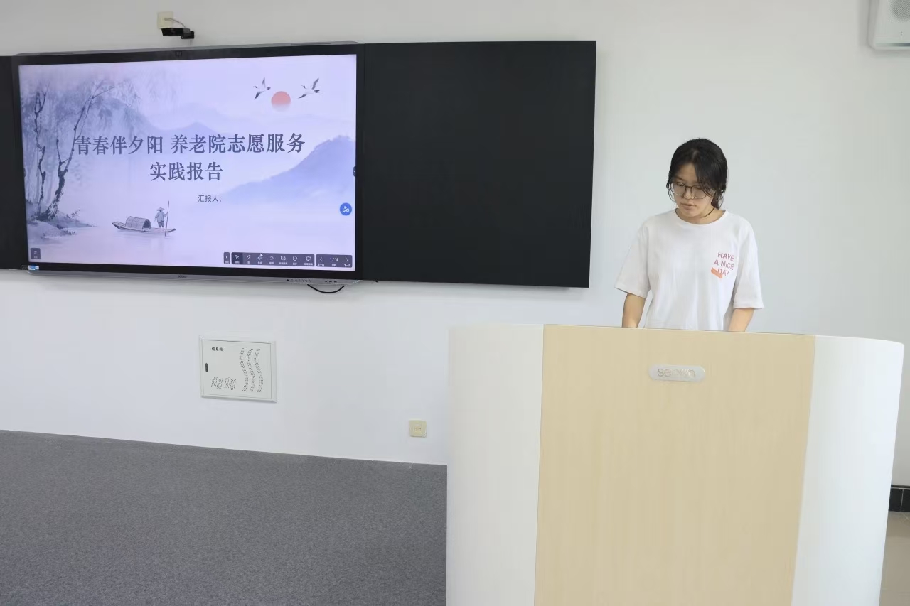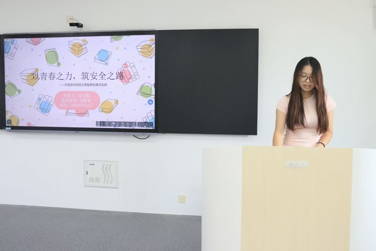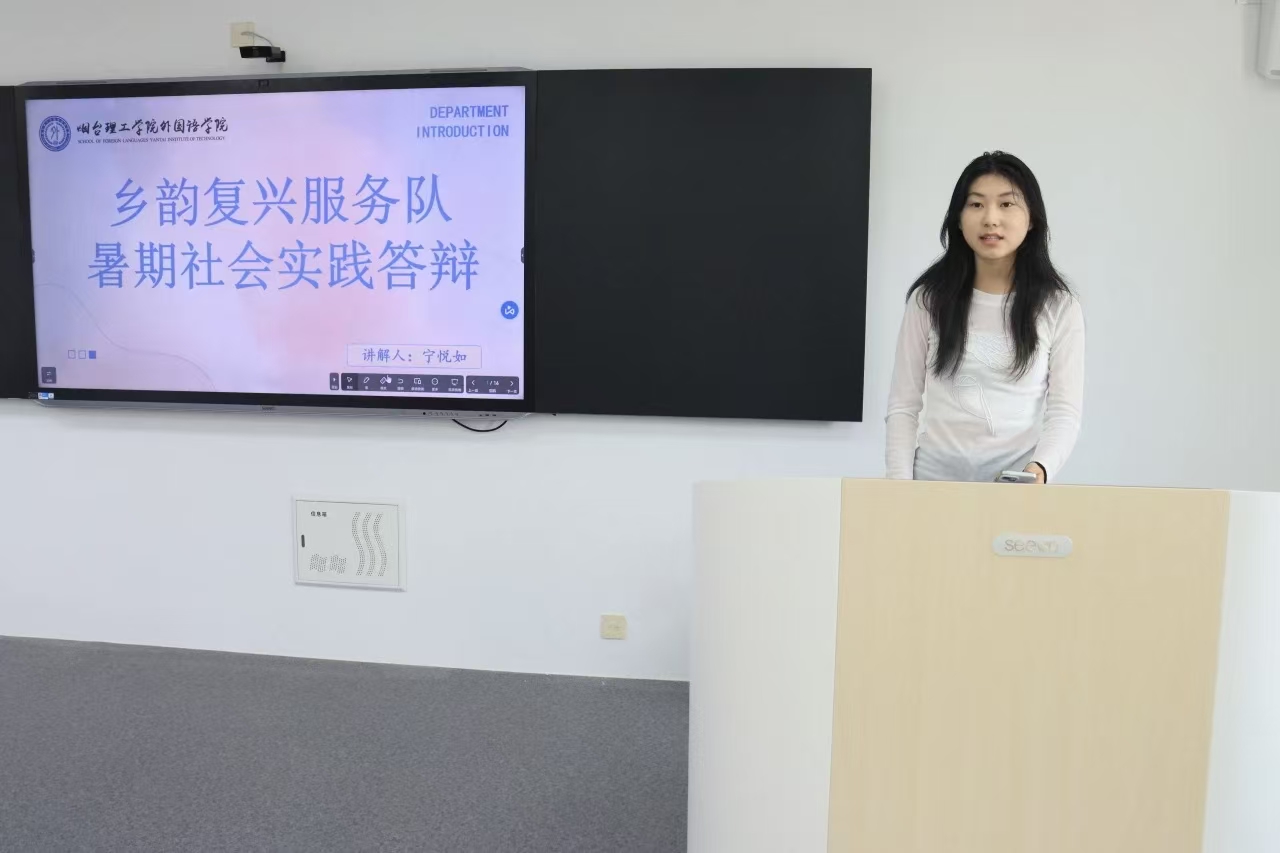 本次答辩会共15支实践队参与,实践主题丰富多样,涵盖“乡韵复兴”、“智慧助老”、“情暖助弱”等多个主题。答辩过程中,各团队以PPT汇报形式,从实践背景、内容、成果、感悟以及反思五方面展开分享。实践队代表依次上台发言,语调沉稳有力,节奏张弛有度,整体表达逻辑清晰、仪态大方,既展现出外国语学院学子的专业素养,也彰显了当代青年在实践中磨砺成长的精神风貌,赢得现场阵阵掌声。