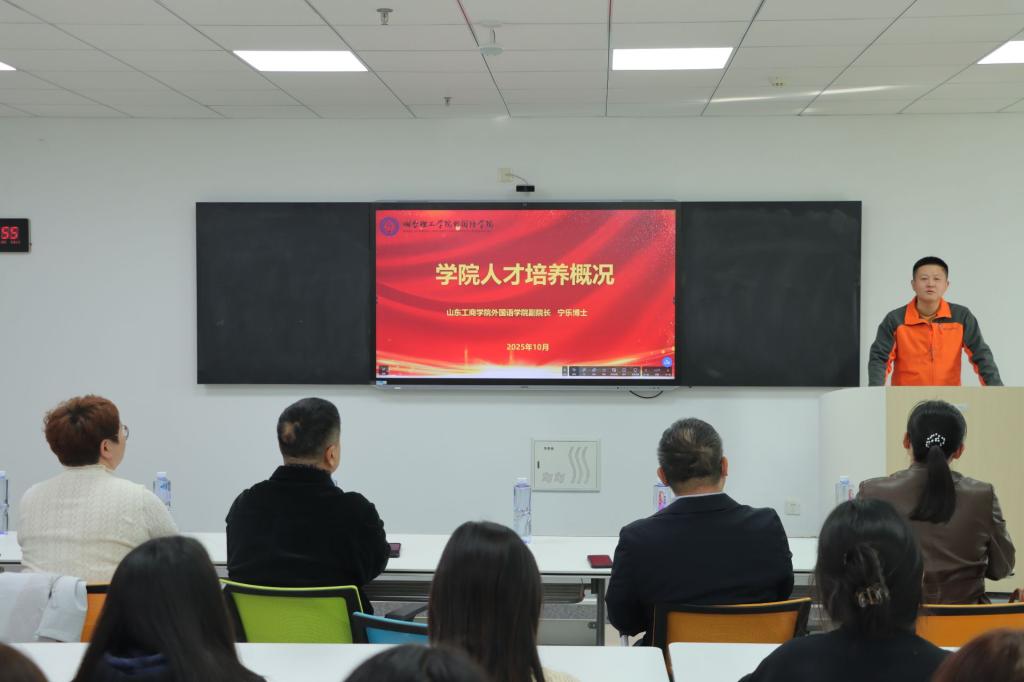 于院长首先介绍学院人才培养概况,围绕“外语 +”融合发展核心定位,从专业建设深耕、实践育人创新、校企协同发力三大维度,系统介绍人才培养工作。随后,现场举行“山东工商学院外国语学院研究生优质生源基地”授牌仪式,崔洪海院长与于巧丽院长共同揭牌,推动两校在人才培养方面的合作迈向新高度。